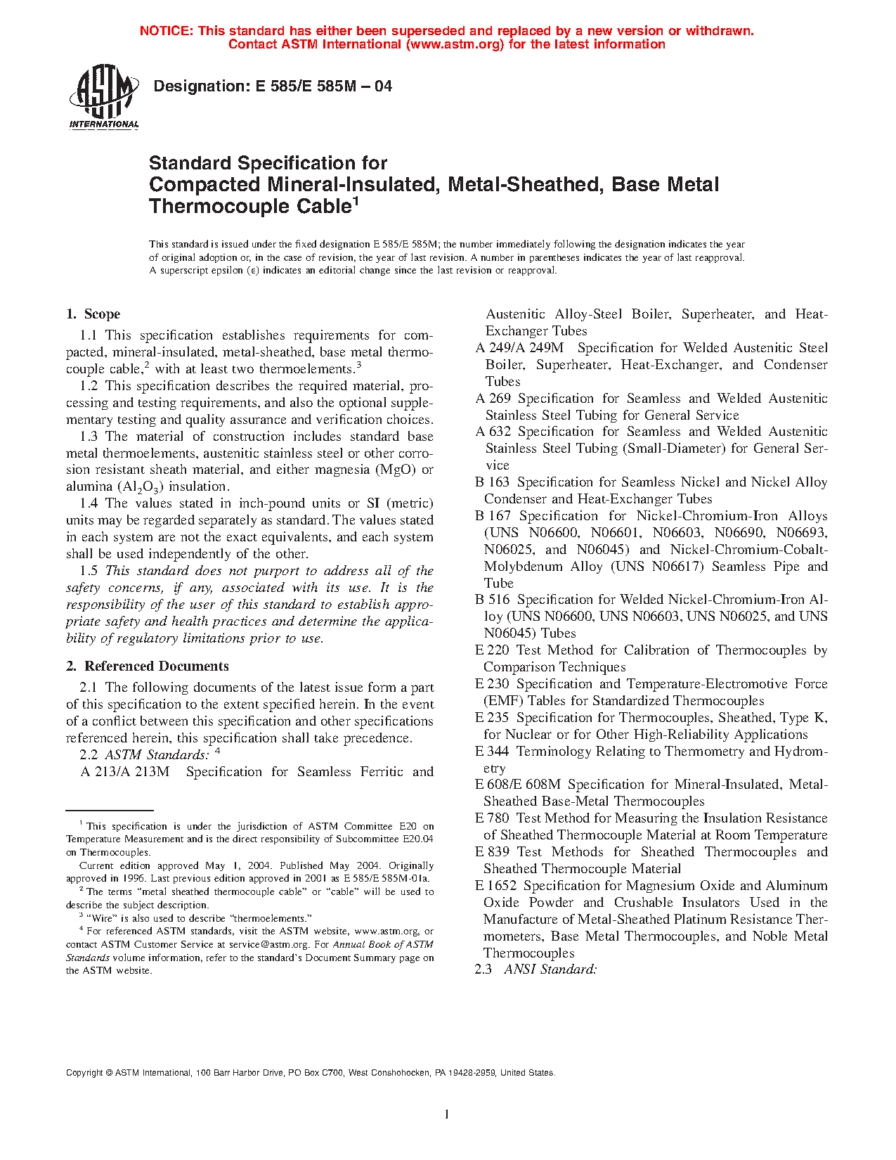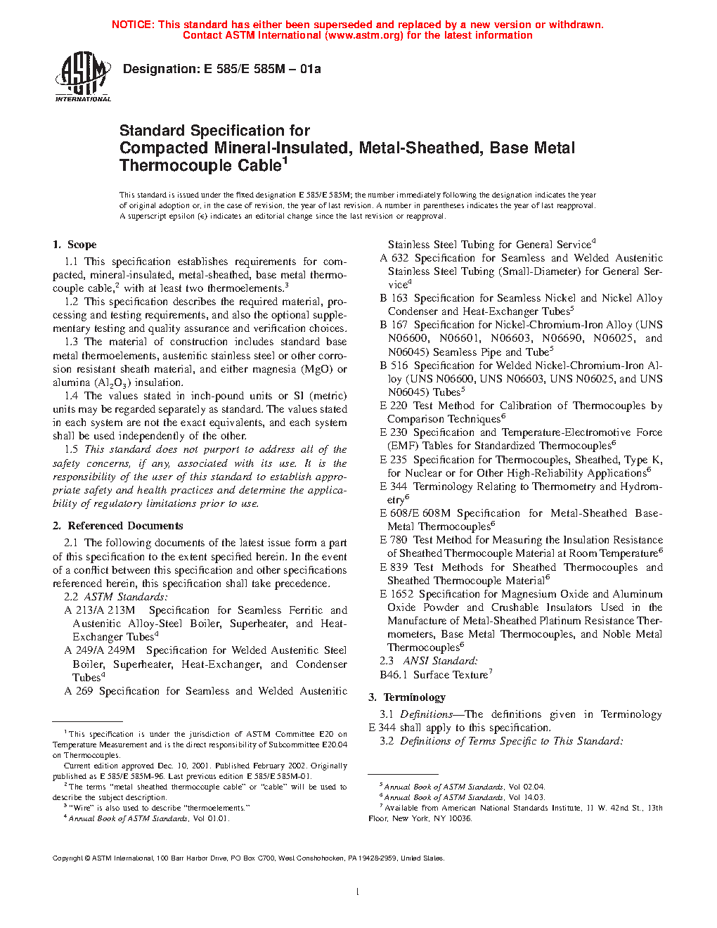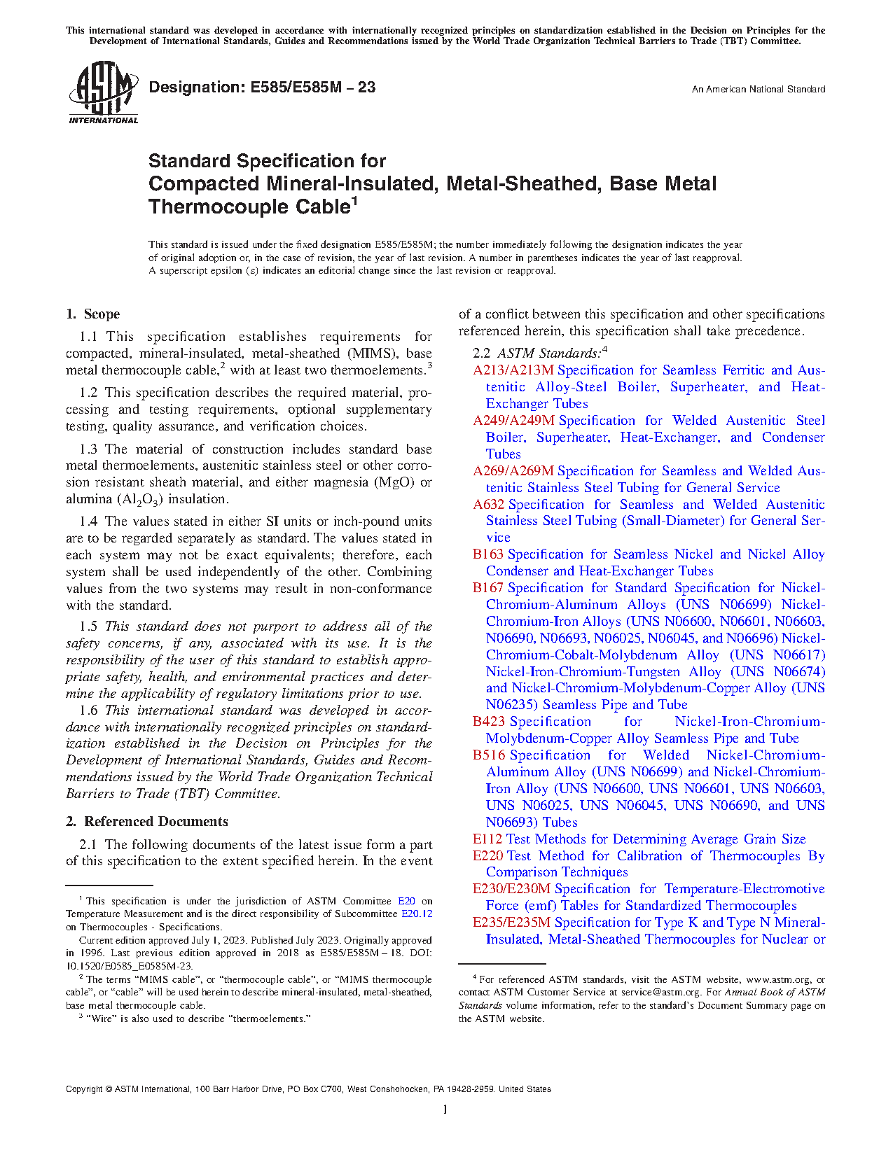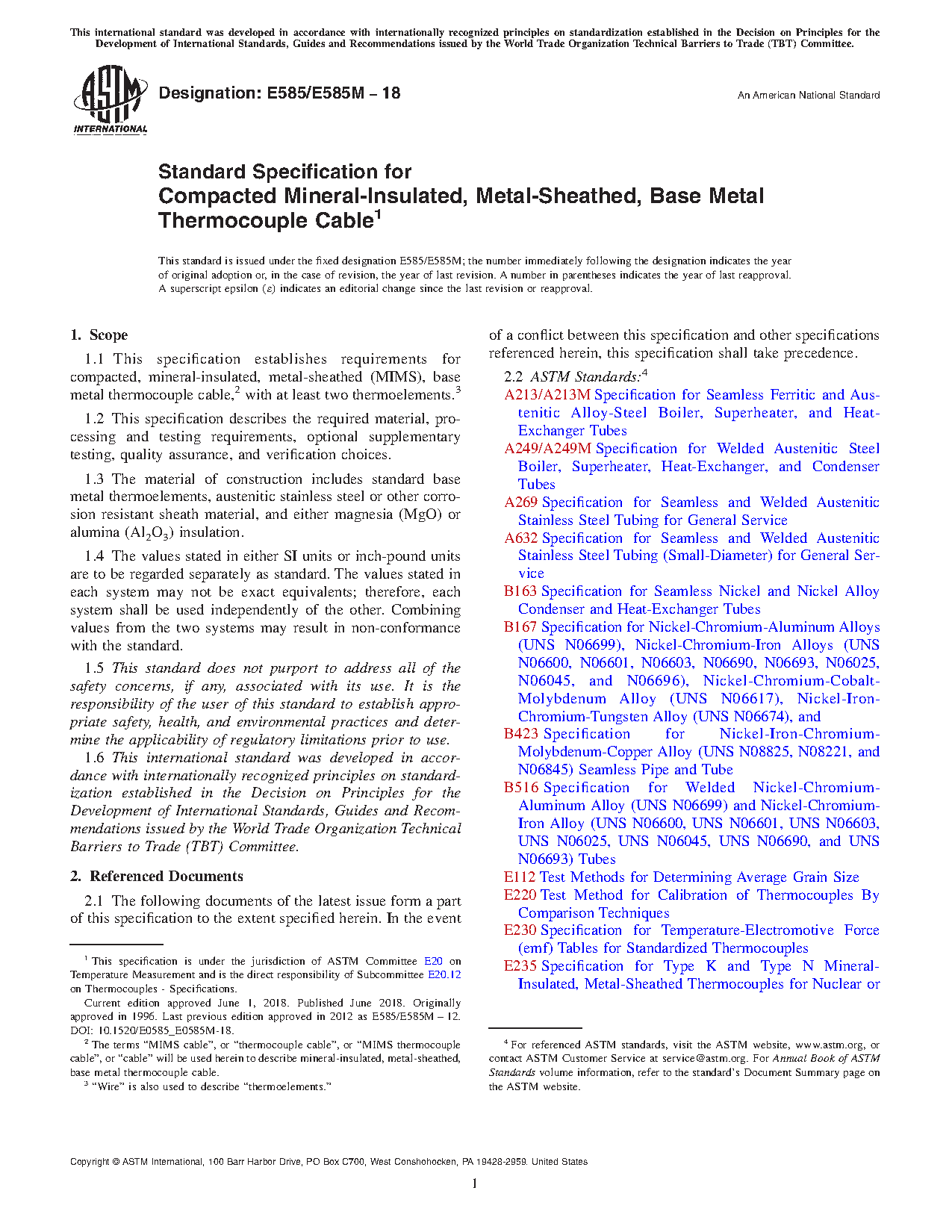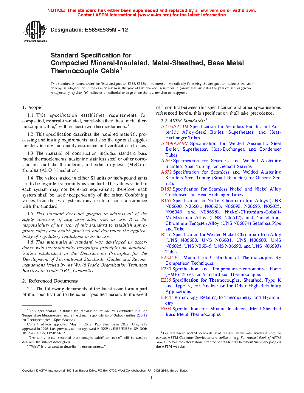 1.1 This specification establishes requirements for compacted, mineral-insulated, metal-sheathed (MIMS), base metal thermocouple cable,2 with at least two thermoelements.3