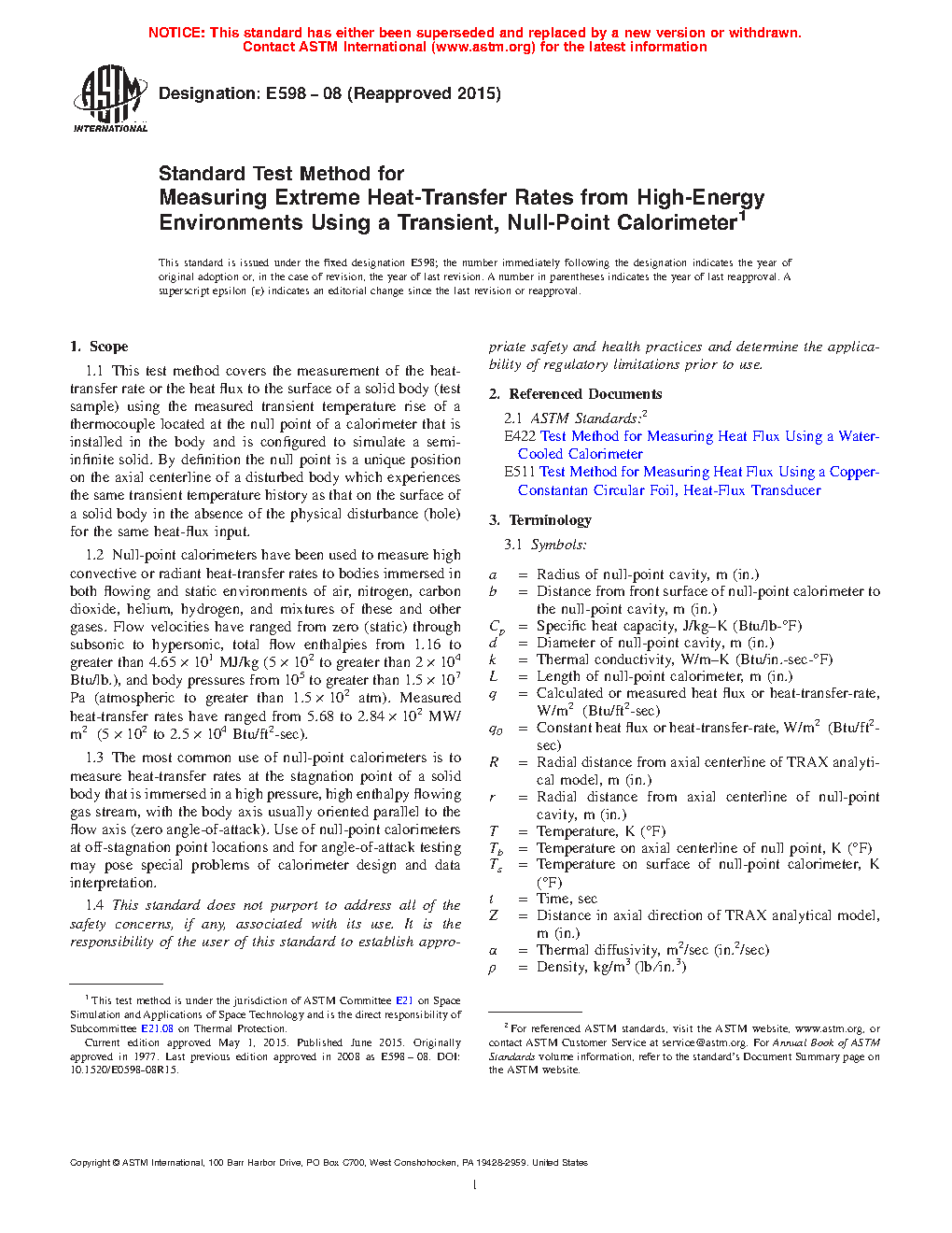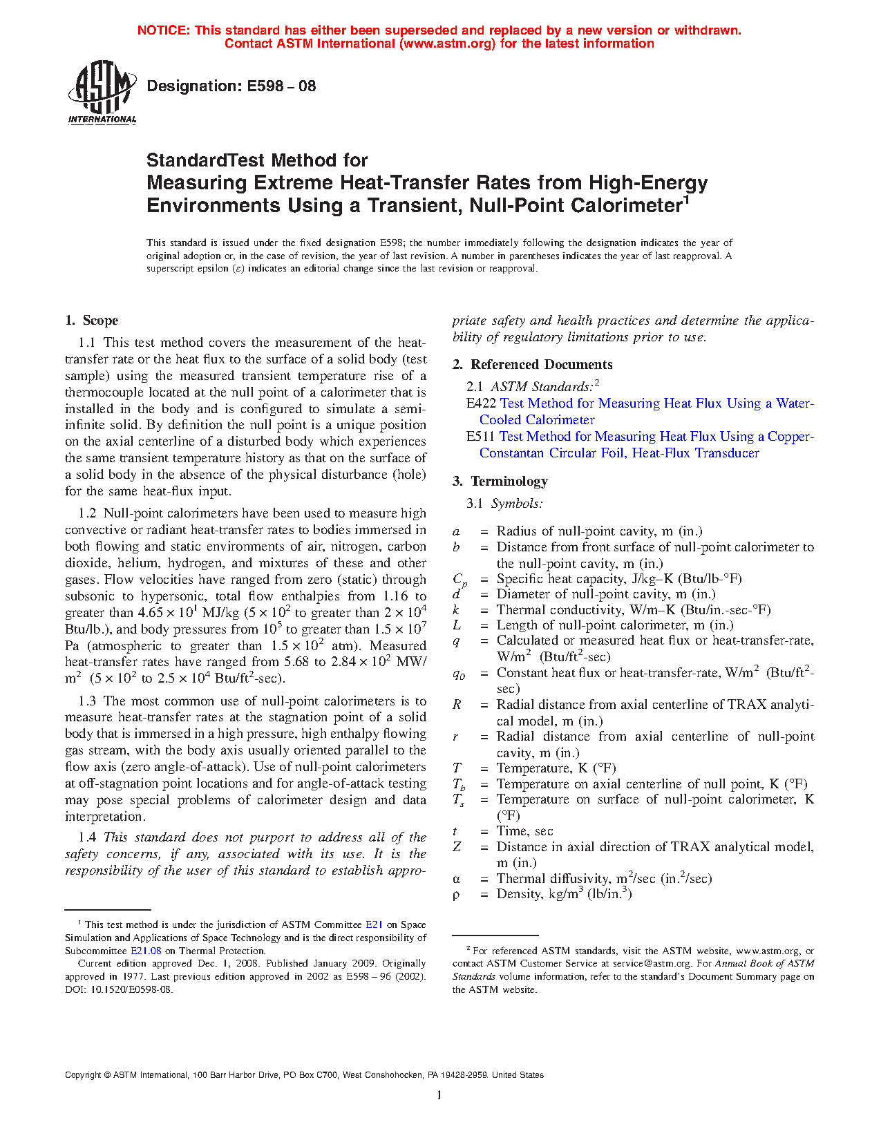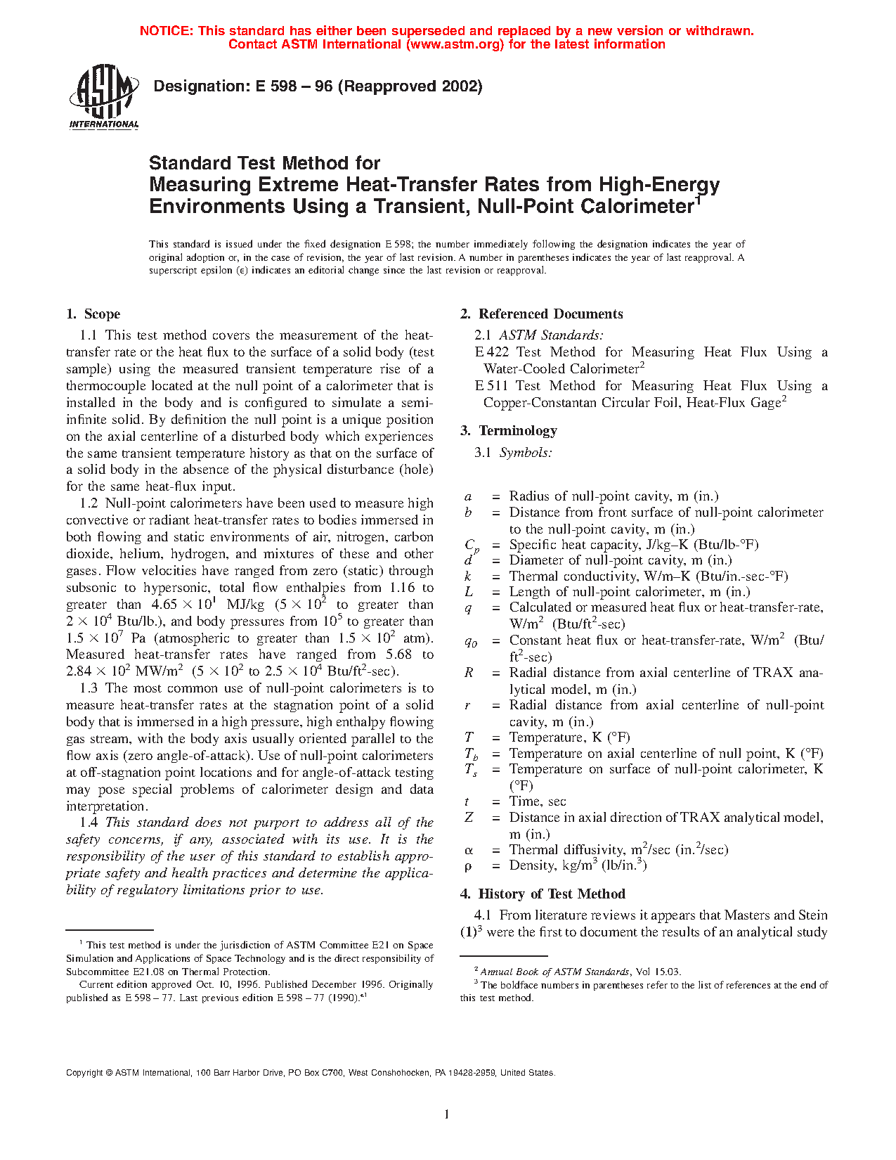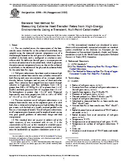 1.1 This test method covers the measurement of the heat-transfer rate or the heat flux to the surface of a solid body (test sample) using the measured transient temperature rise of a thermocouple located at the null point of a calorimeter that is installed in the body and is configured to simulate a semi-infinite solid. By definition the null point is a unique position on the axial centerline of a disturbed body which experiences the same transient temperature history as that on the surface of a solid body in the absence of the physical disturbance (hole) for the same heat-flux input.