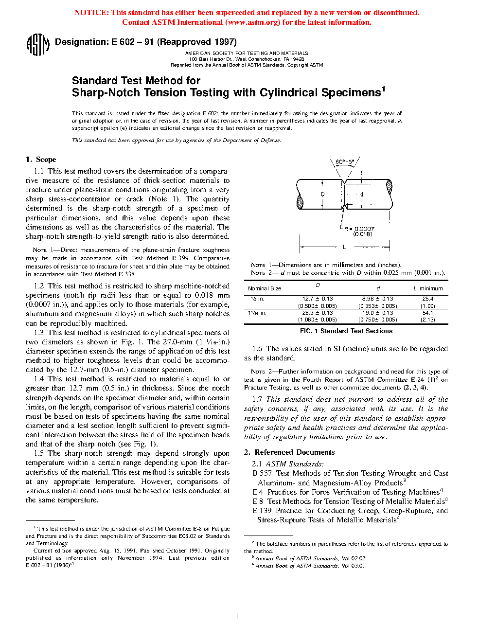 1.4 This test method is restricted to materials equal to or greater than 12.7 mm (0.5 in.) in thickness. Since the notch strength depends on the specimen diameter and, within certain limits, on the length, comparison of various material conditions must be based on tests of specimens having the same nominal diameter and a test section length sufficient to prevent significant interaction between the stress field of the specimen heads and that of the sharp notch (see Fig. 1).