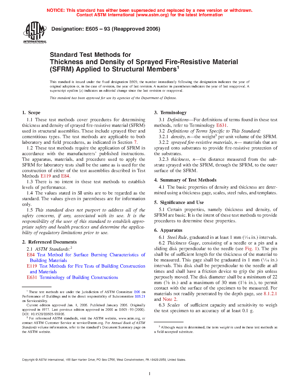 1.2 These test methods require the application of SFRM in accordance with the manufacturers' published instructions. The apparatus, materials, and procedure used to apply the SFRM for laboratory tests shall be the same as is used for the construction of either of the test assemblies described in Test Methods E119 and E84.