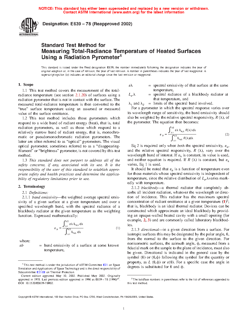 1.1 This test method covers the measurement of the total-radiance temperature (see section 2.1.20) of surfaces using a radiation pyrometer that is not in contact with the surface. The measured total-radiance temperature is then converted to the "true" surface temperature using an assumed or measured value of the surface emittance.