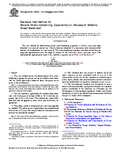 1.1 This test method covers the determination of a strain-hardening exponent by tension testing of metallic sheet materials for which plastic-flow behavior obeys the power curve given in the Introduction.