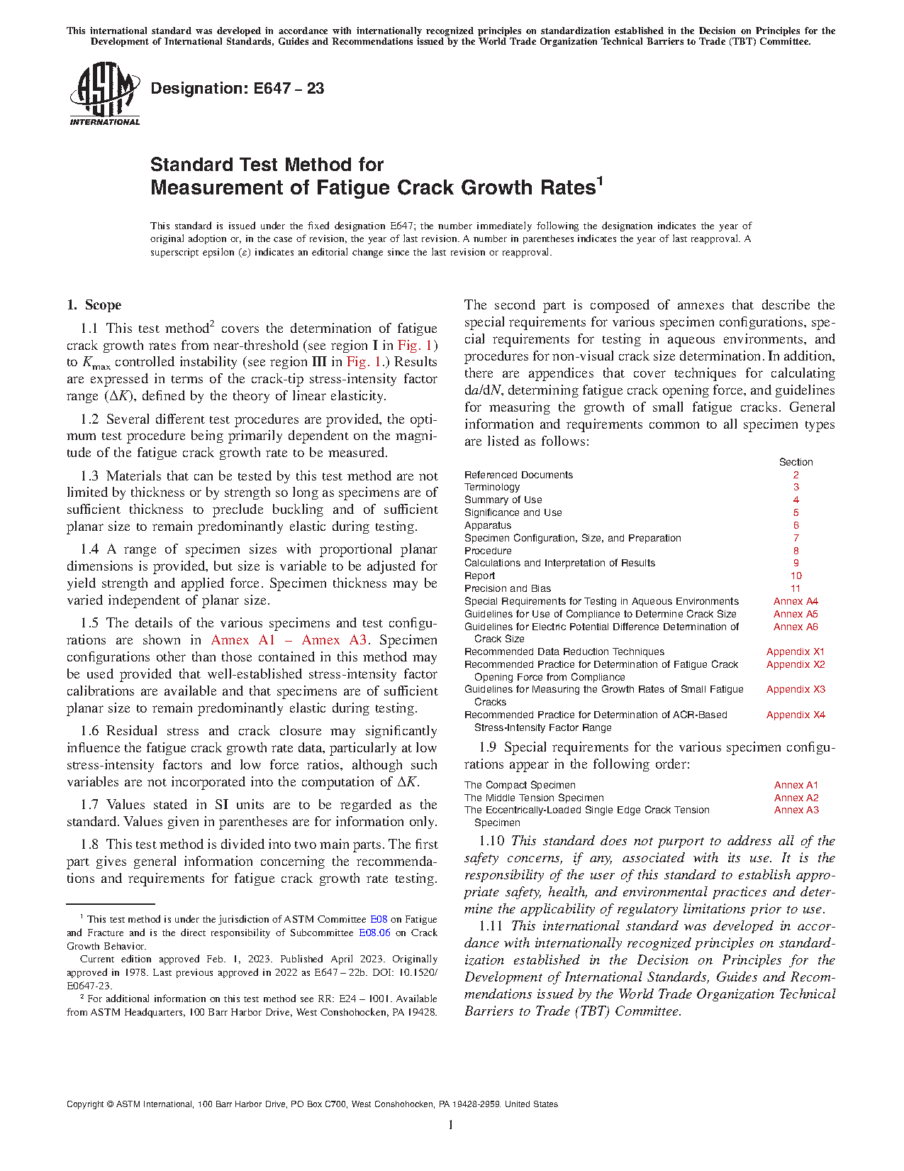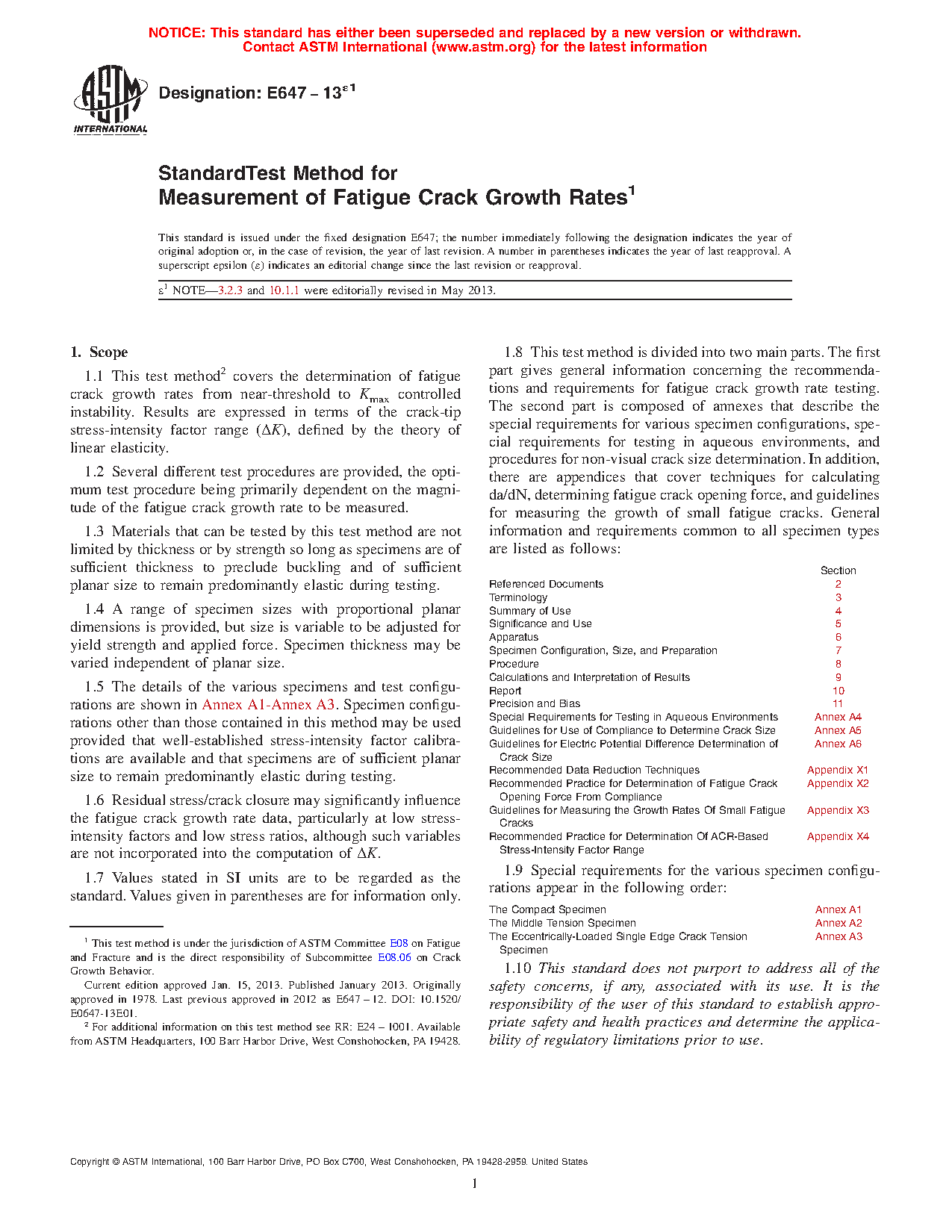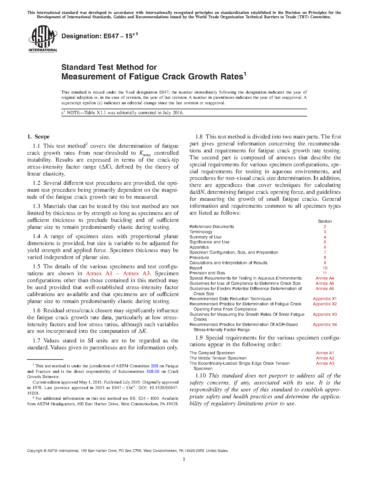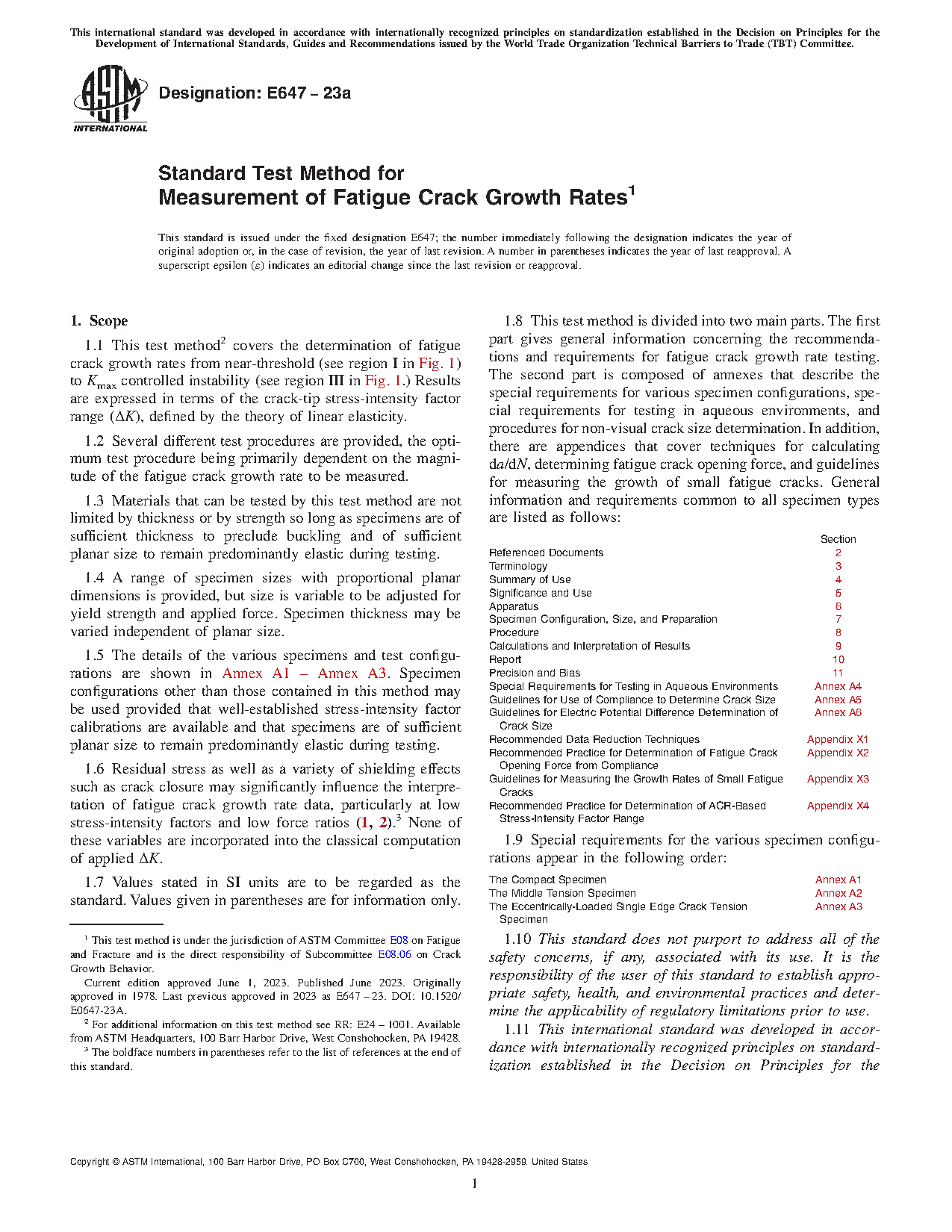 1.8 This test method is divided into two main parts. The first part gives general information concerning the recommendations and requirements for fatigue crack growth rate testing. The second part is composed of annexes that describe the special requirements for various specimen configurations, special requirements for testing in aqueous environments, and procedures for non-visual crack size determination. In addition, there are appendices that cover techniques for calculating da/dN, determining fatigue crack opening force, and guidelines for measuring the growth of small fatigue cracks. General information and requirements common to all specimen types are listed as follows: