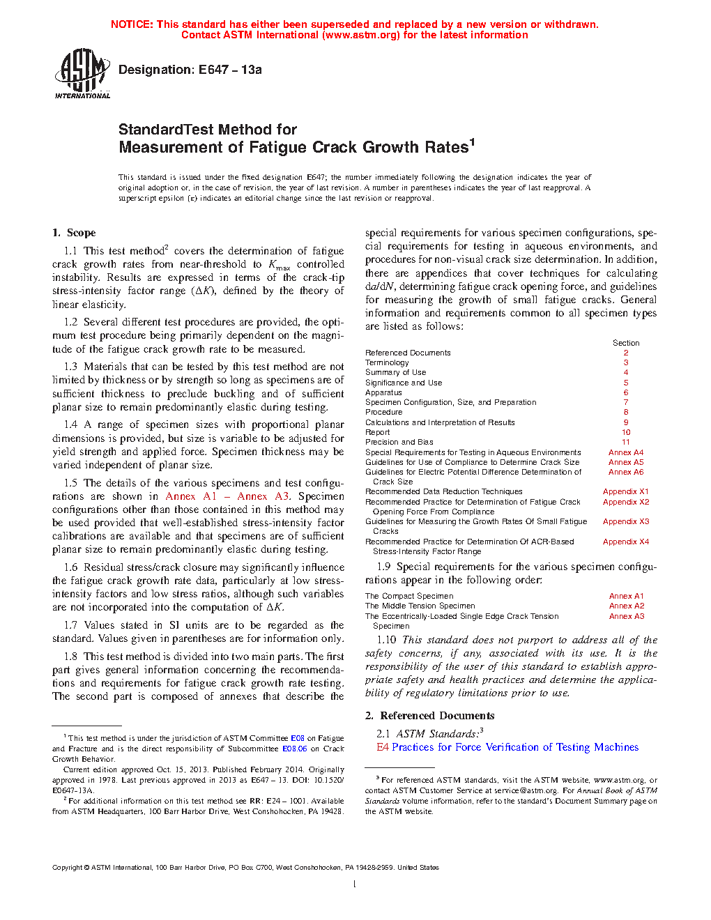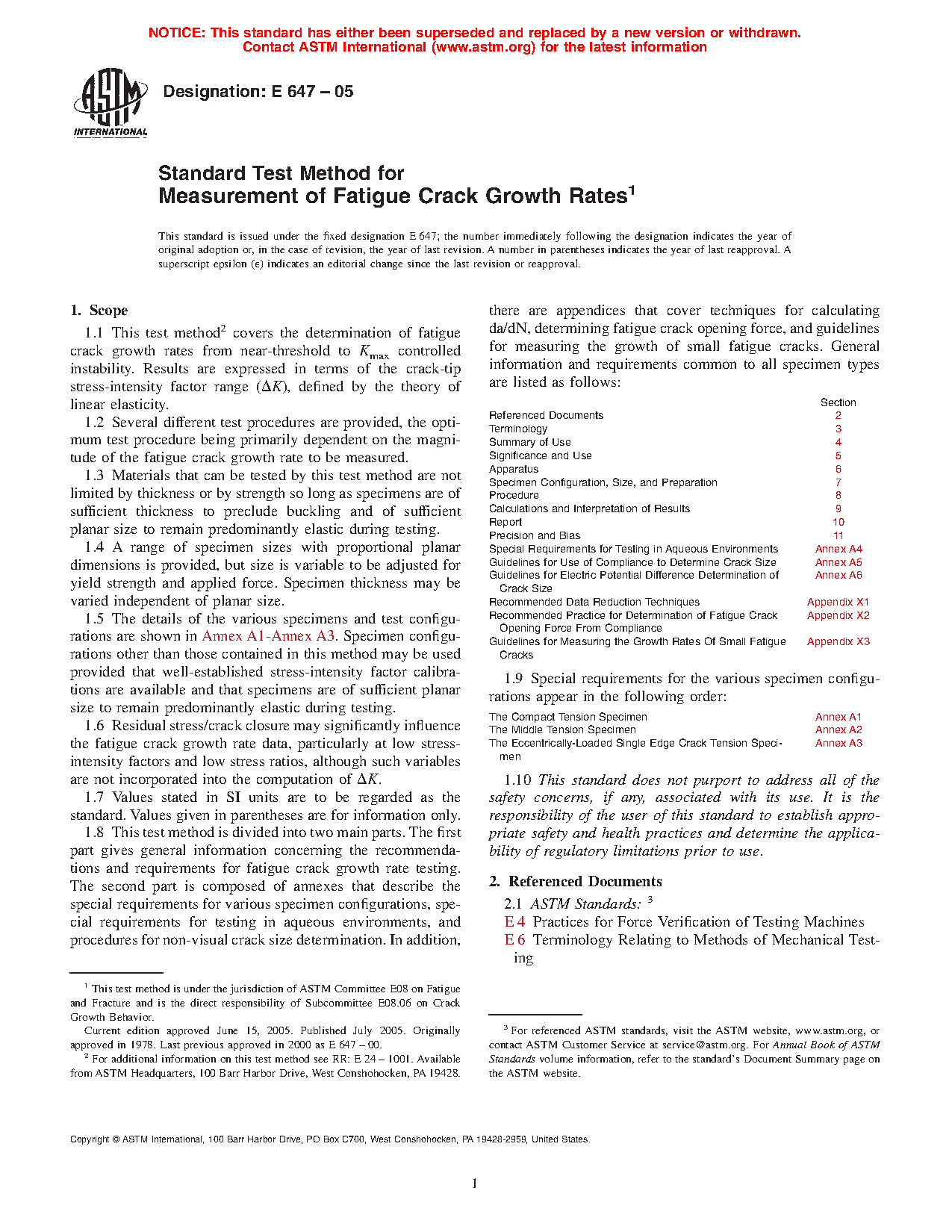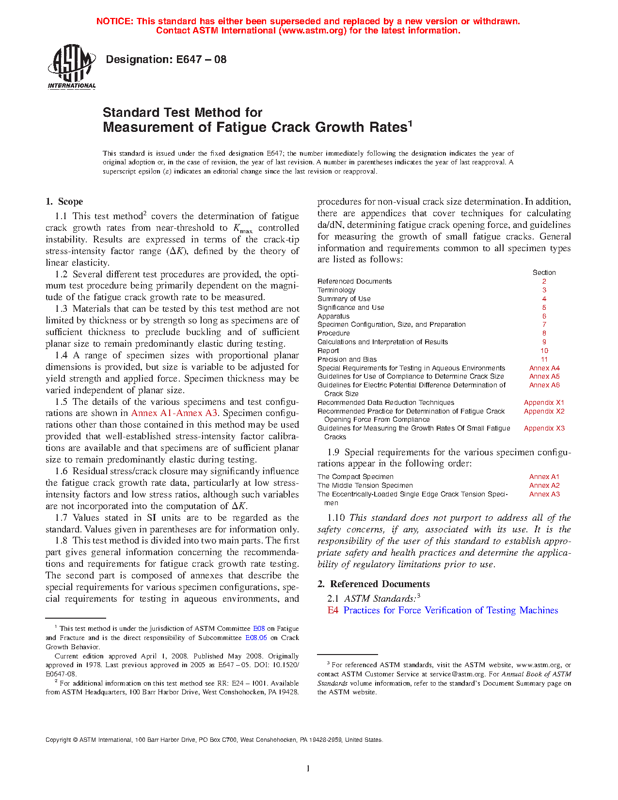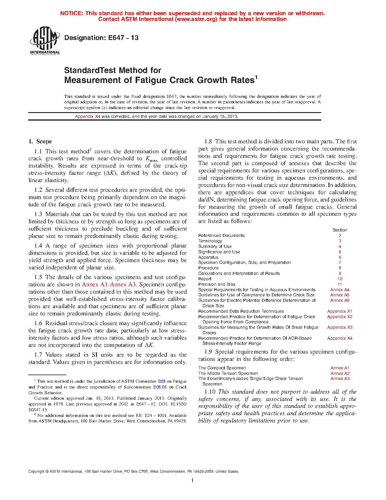 1.8 This test method is divided into two main parts. The first part gives general information concerning the recommendations and requirements for fatigue crack growth rate testing. The second part is composed of annexes that describe the special requirements for various specimen configurations, special requirements for testing in aqueous environments, and procedures for non-visual crack size determination. In addition, there are appendices that cover techniques for calculating da/dN, determining fatigue crack opening force, and guidelines for measuring the growth of small fatigue cracks. General information and requirements common to all specimen types are listed as follows: