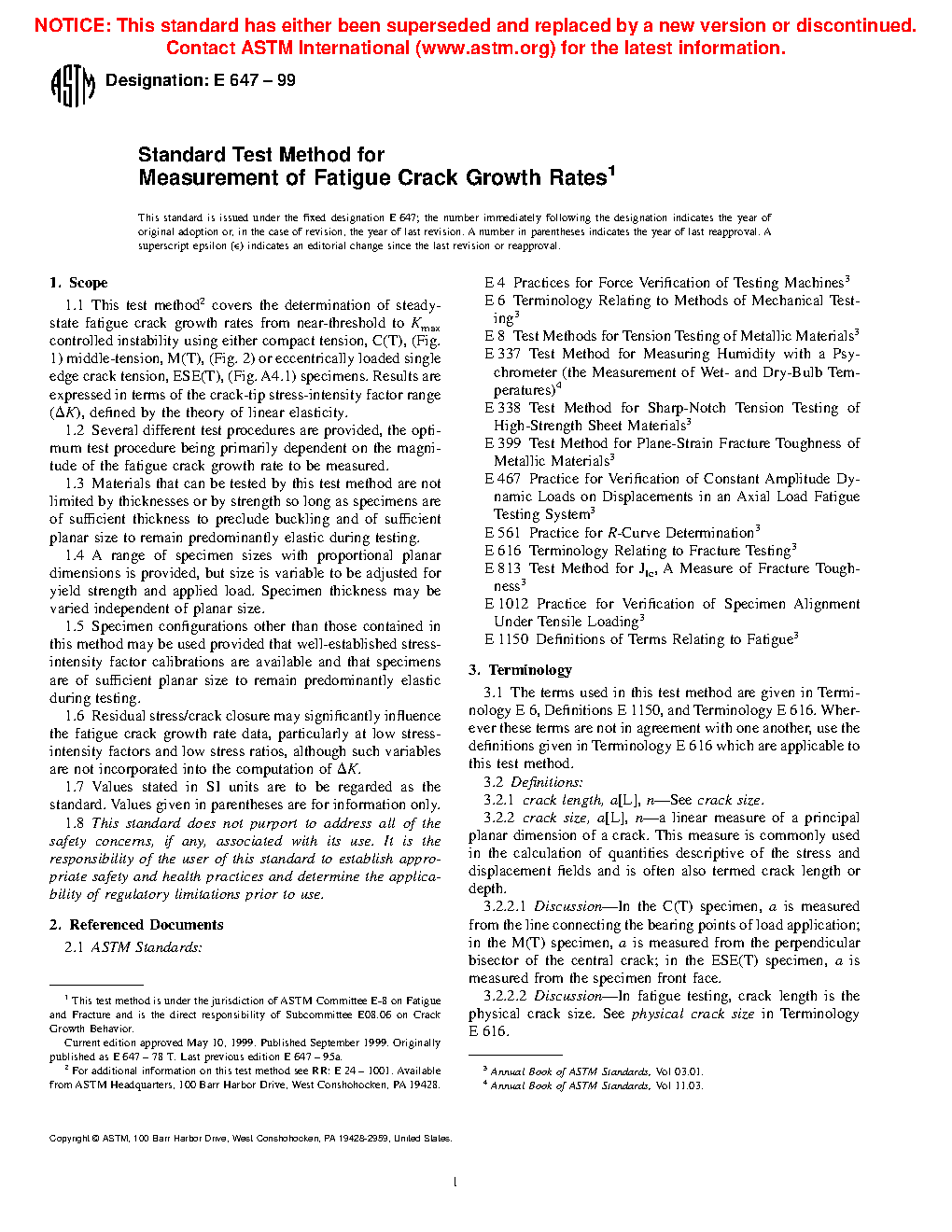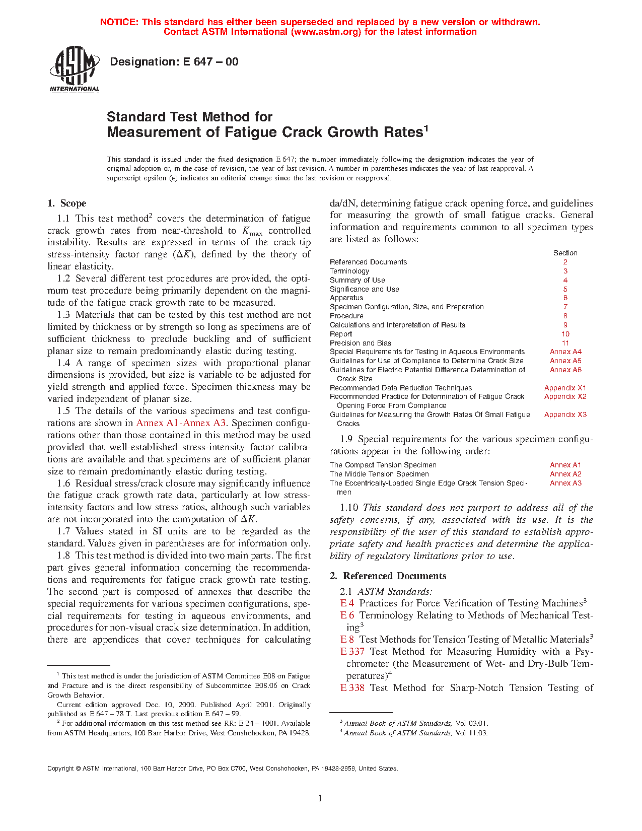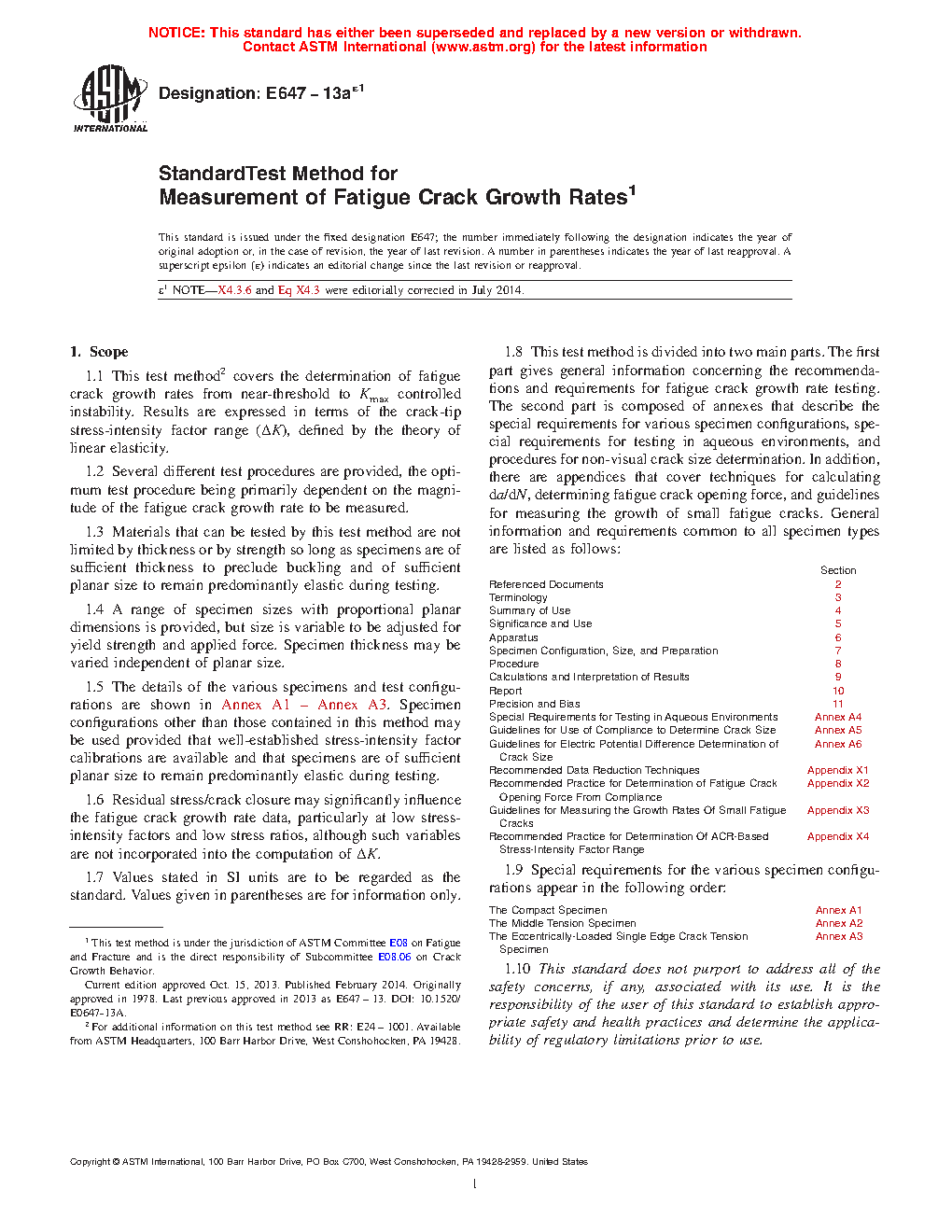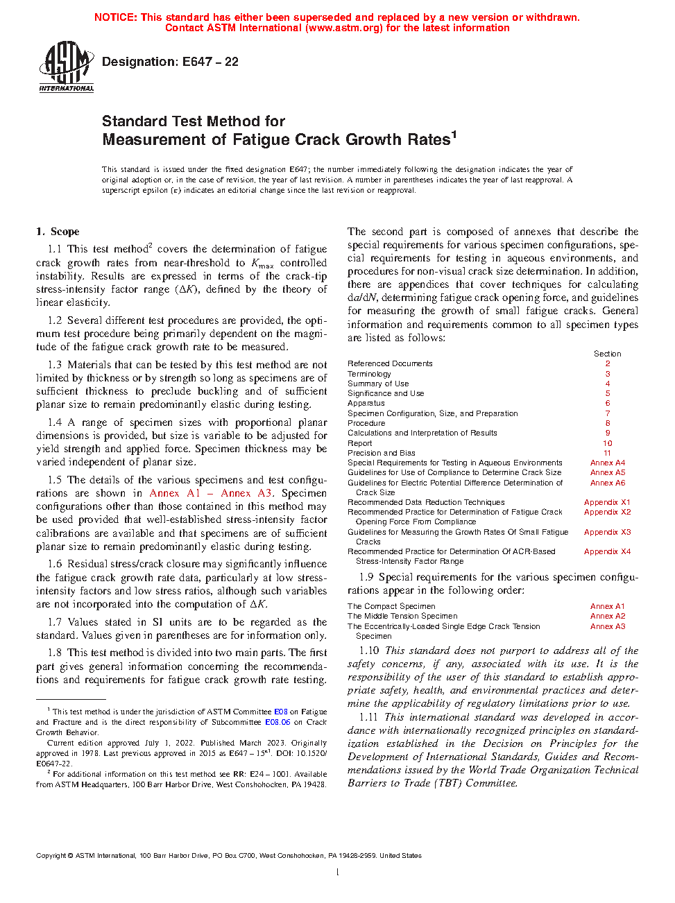 1.8 This test method is divided into two main parts. The first part gives general information concerning the recommendations and requirements for fatigue crack growth rate testing. The second part is composed of annexes that describe the special requirements for various specimen configurations, special requirements for testing in aqueous environments, and procedures for non-visual crack size determination. In addition, there are appendices that cover techniques for calculating da/dN, determining fatigue crack opening force, and guidelines for measuring the growth of small fatigue cracks. General information and requirements common to all specimen types are listed as follows: