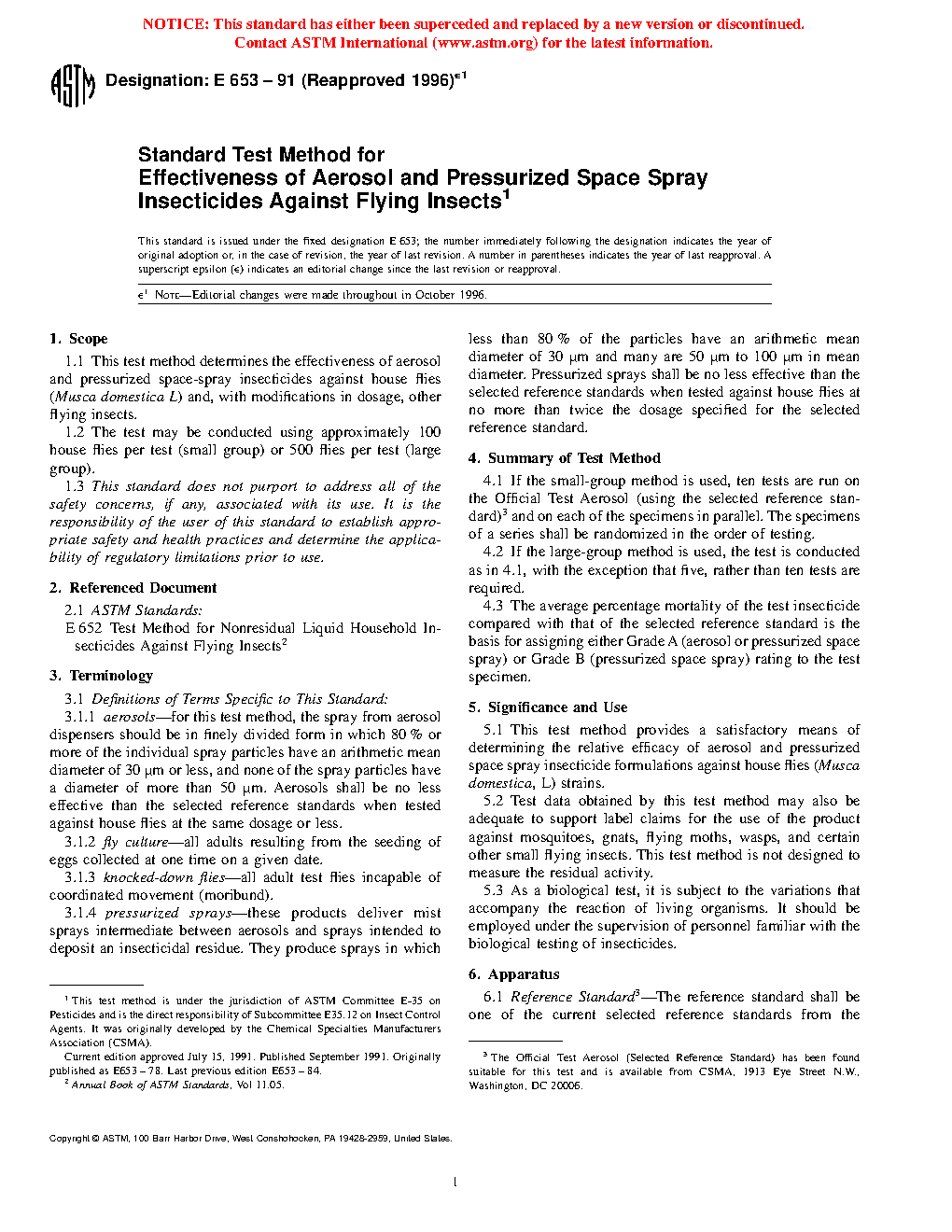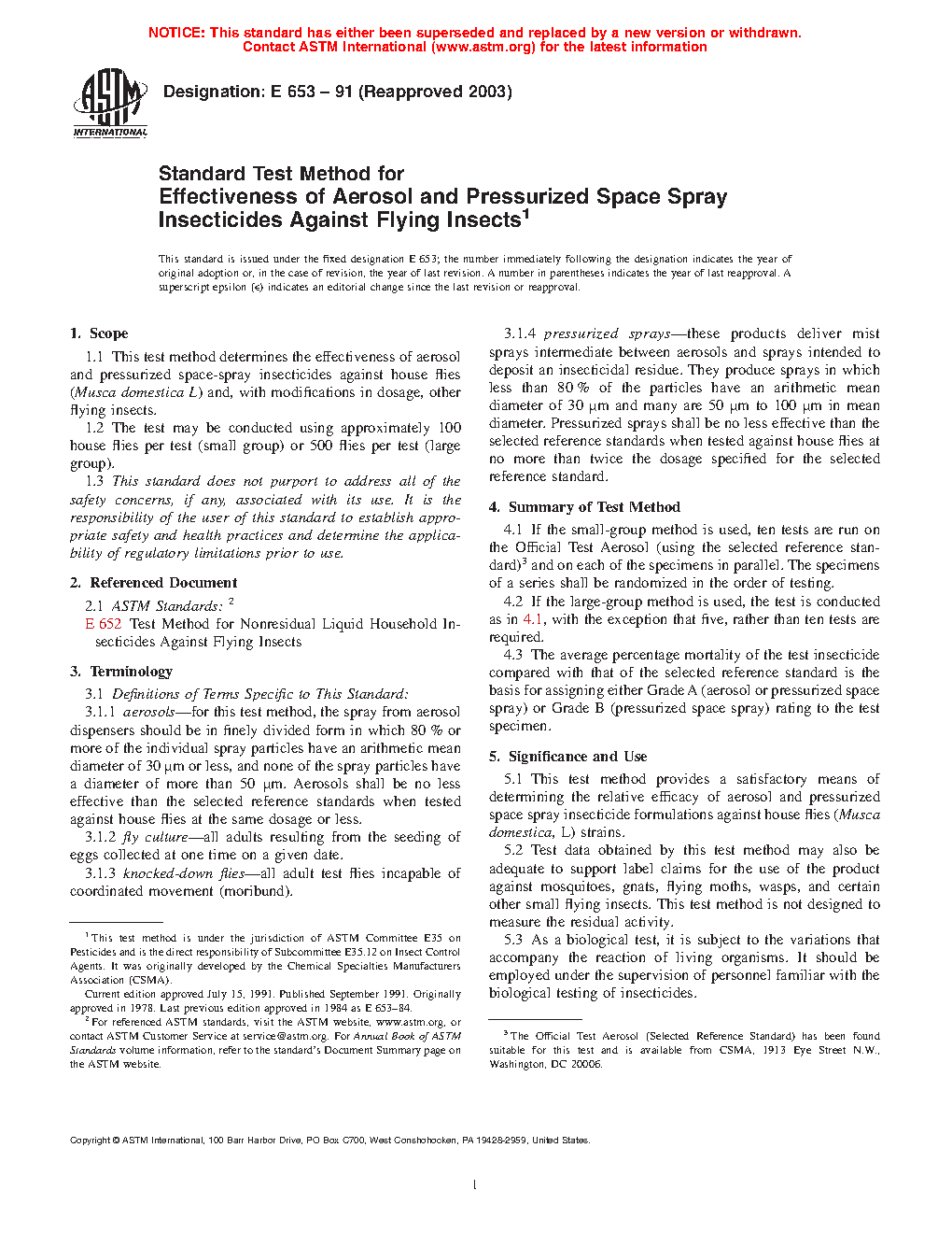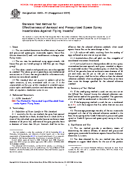 1.1 This test method determines the effectiveness of aerosol and pressurized space-spray insecticides against house flies (Musca domestica L) and, with modifications in dosage, other flying insects.