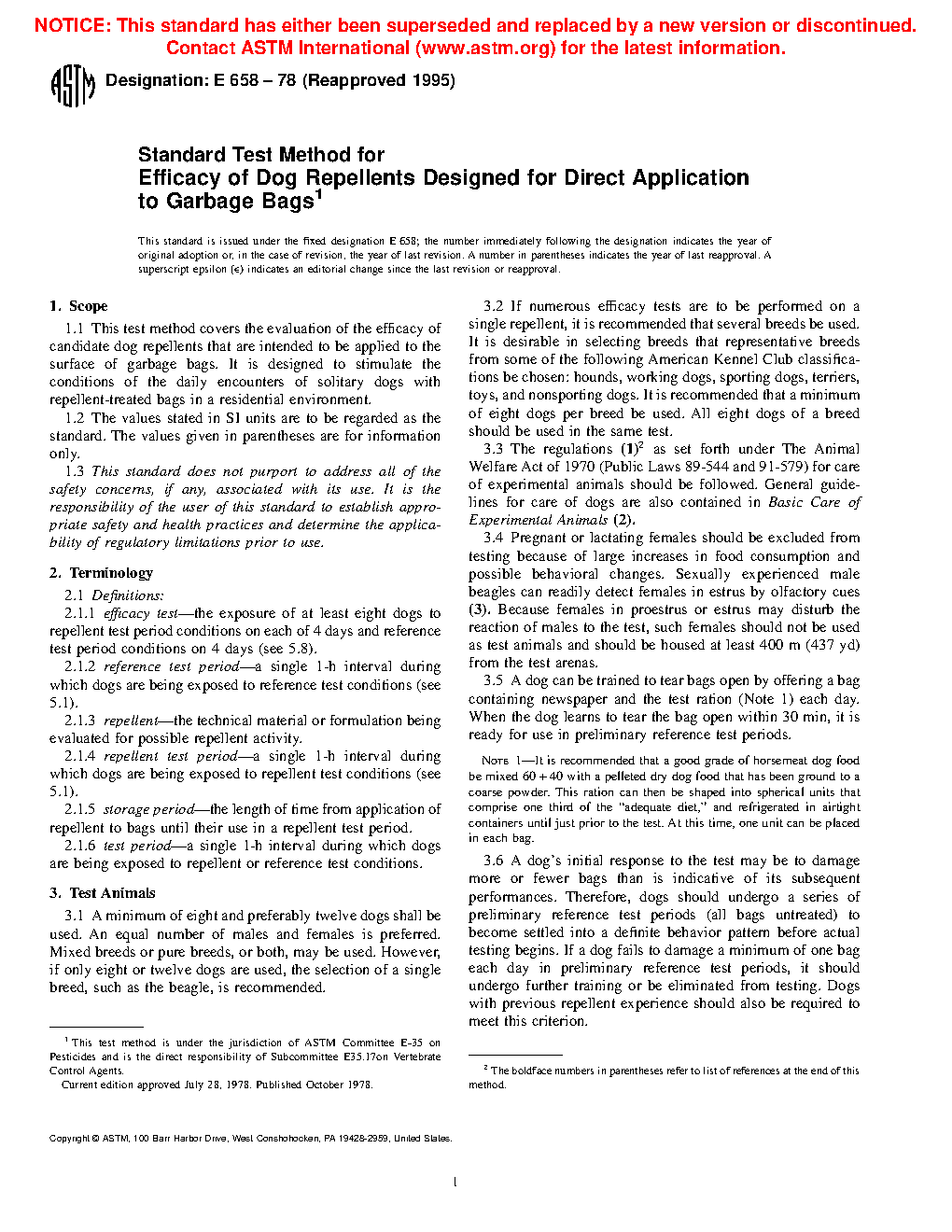 1.1 This method covers the evaluation of the efficacy of candidate dog repellents that are intended to be applied to the surface of garbage bags. It is designed to stimulate the conditions of the daily encounters of solitary dogs with repellent-treated bags in a residential environment.