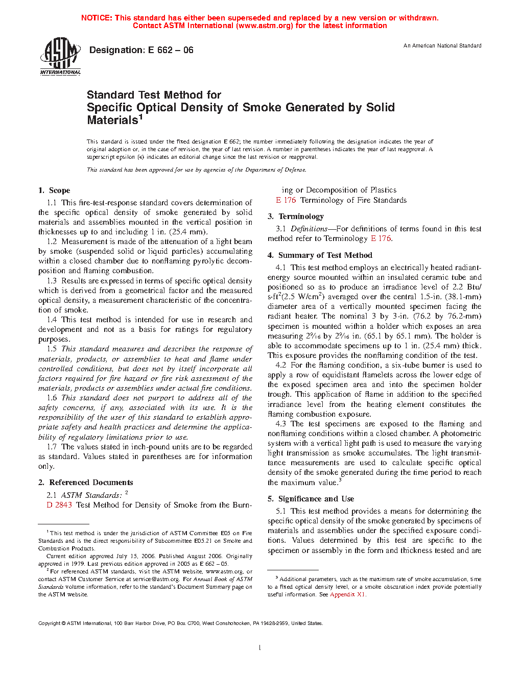 1.1 This fire-test-response standard covers determination of the specific optical density of smoke generated by solid materials and assemblies mounted in the vertical position in thicknesses up to and including 1 in. (25.4 mm).
