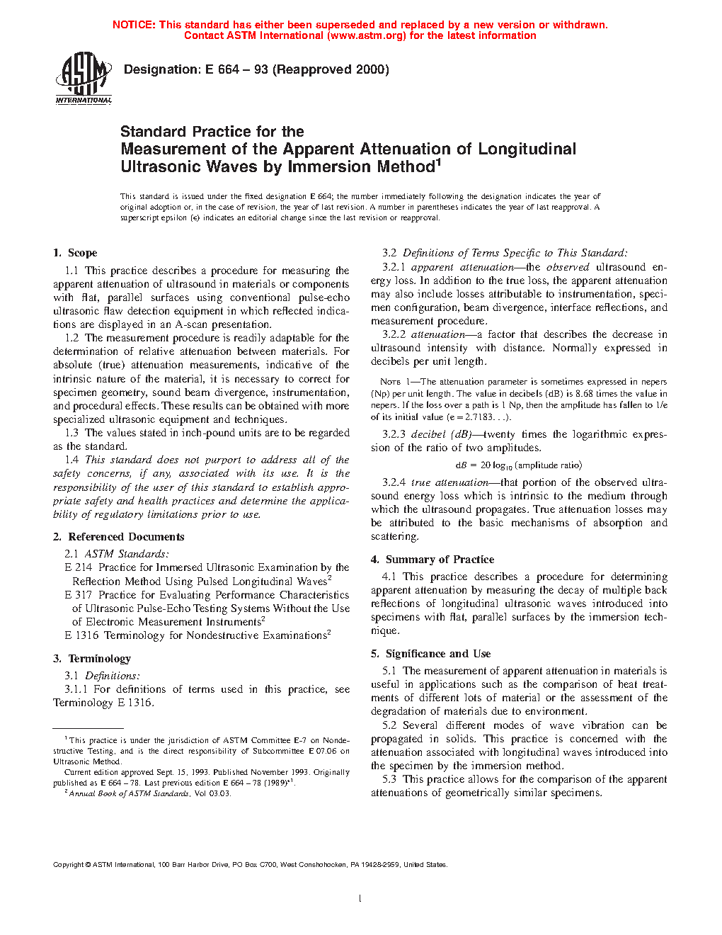 1.2 The measurement procedure is readily adaptable for the determination of relative attenuation between materials. For absolute (true) attenuation measurements, indicative of the intrinsic nature of the material, it is necessary to correct for specimen geometry, sound beam divergence, instrumentation, and procedural effects. These results can be obtained with more specialized ultrasonic equipment and techniques.