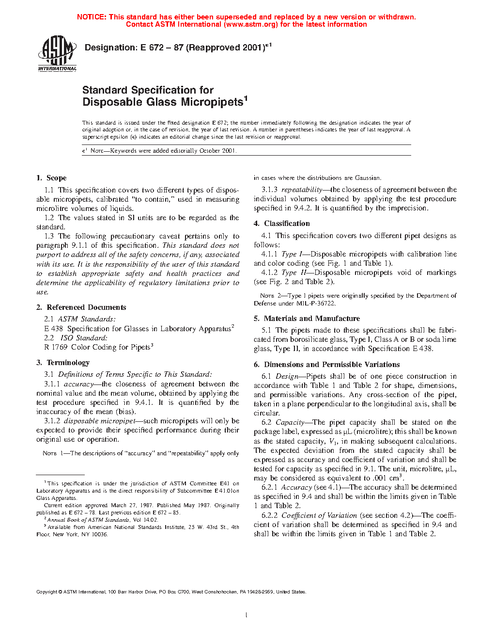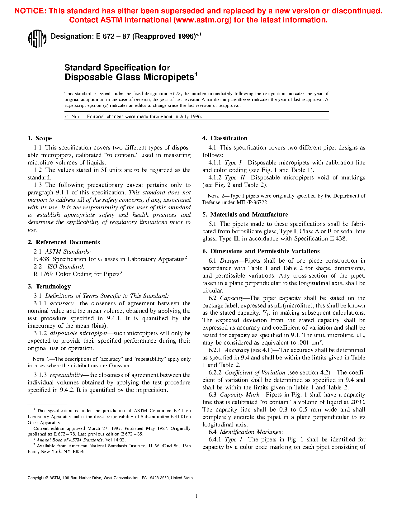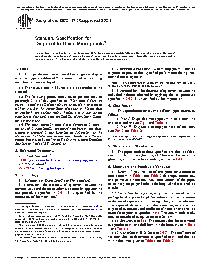 1.1 This specification covers two different types of disposable micropipets, calibrated “to contain,” used in measuring microlitre volumes of liquids.