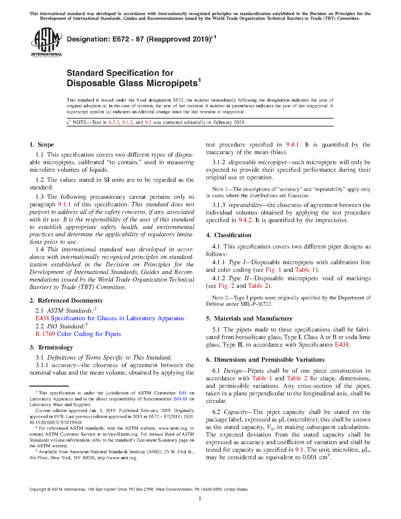 This specification covers two different types of disposable glass micropipets, calibrated “to contain,” used in measuring microlitre volumes of liquids. The pipets made to these specifications shall be fabricated from borosilicate glass (Type I, Class A or B) or soda lime glass (Type II). Pipets shall be of one piece construction and shall meet the specified requirements for shape, dimensions, and capacity. The calibration line and identification markings such as color code marking are illustrated. The methods of reading and setting a liquid meniscus and a mercury meniscus are detailed. Capacity test shall be performed and calculation of micropipet volume shall be taken using the given formula.