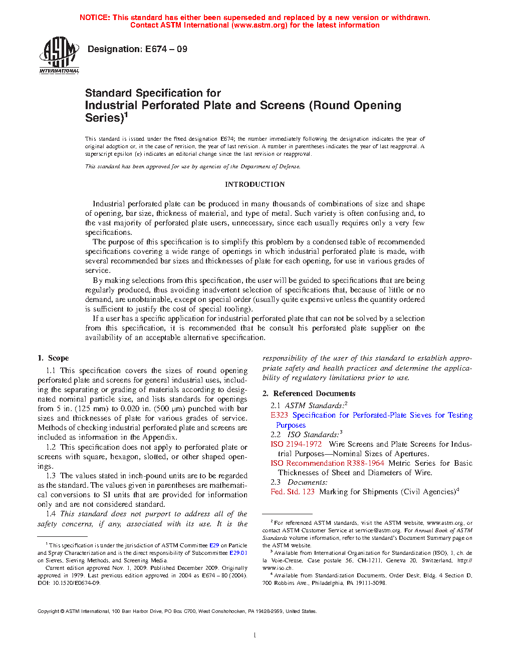 This specification covers the various sizes of round opening perforated plates and screens for general industrial uses, including the separating or grading of materials according to designated nominal particle size, and lists standards for openings punched with various bar sizes and thicknesses of plate for various grades of service. This specification does not apply to perforated plates or screens with square, hexagon, slotted, or other shaped openings.