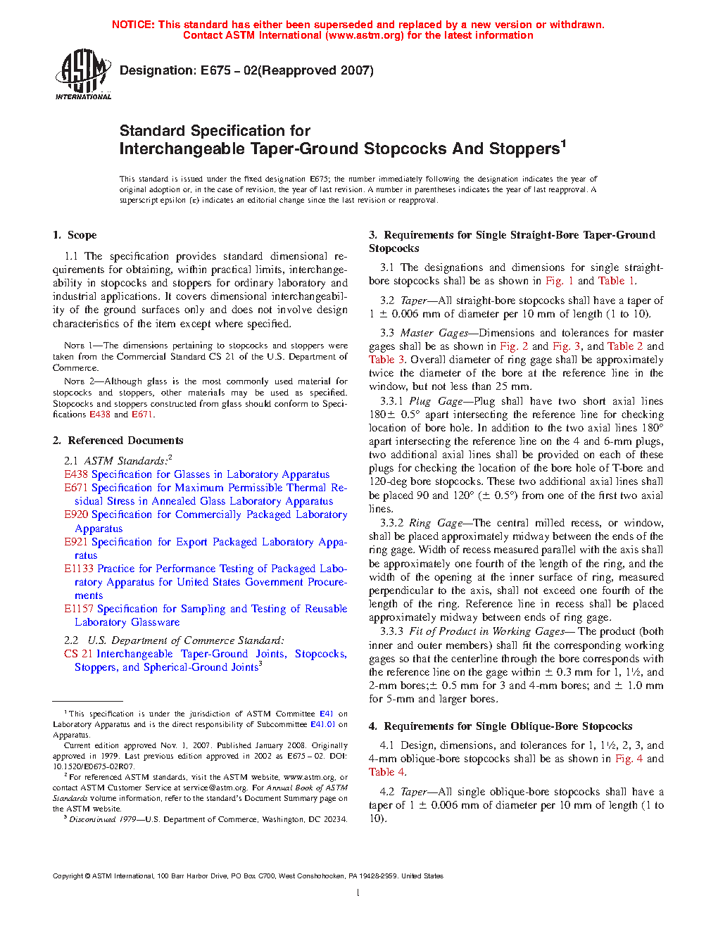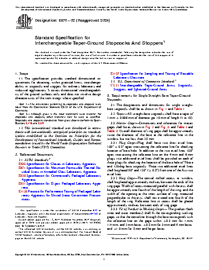 The specification provides the standard dimensional requirements for obtaining, within practical limits, interchangeability in stopcocks and stoppers for ordinary laboratory and industrial applications. It solely covers ground surfaces dimensional interchangeability, and does not involve design characteristics of the item except where specified. Materials shall be tested and shall conform to the specified values of design, dimension, designation, tolerances, taper, and master gages; as stated in the requirements for Single Straight-Bore Taper-Ground Stopcocks, Single Oblique-Bore Stopcocks, Double Oblique-Bore (Three-Way) Stopcocks, T-Bore and 120-deg Bore Stopcocks, Taper-Ground Flask Stoppers, and Taper-Ground Bottle Stoppers.