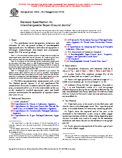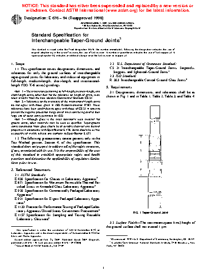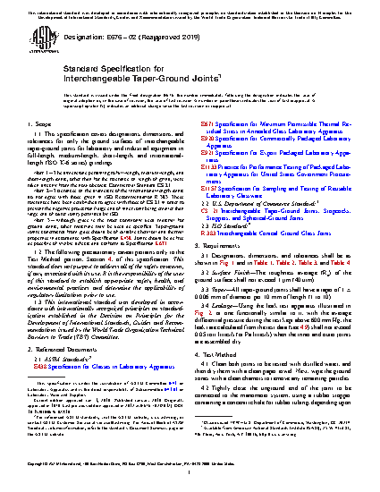 1.1 This specification covers designations, dimensions, and tolerances for only the ground surfaces of interchangeable taper-ground joints for laboratory and industrial equipment in full-length, medium-length, short-length, and international-length (ISO K-6 series) grindings.