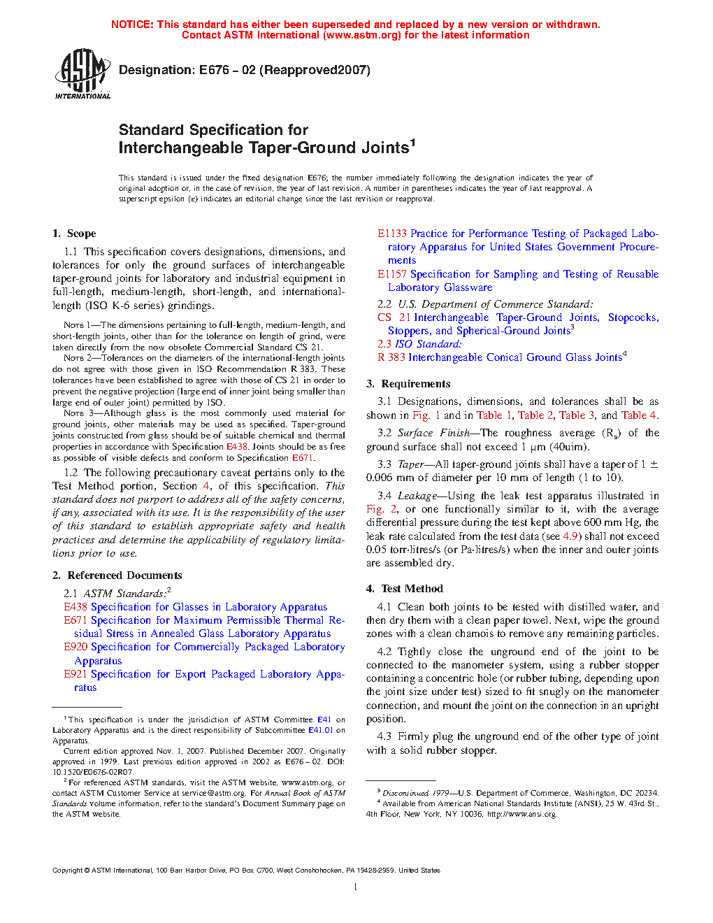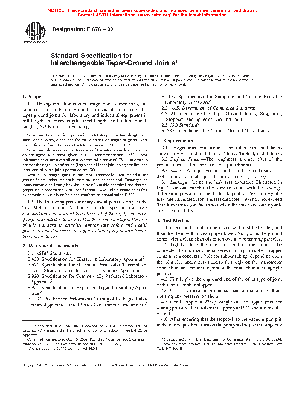 Note 3: Although glass is the most commonly used material for ground joints, other materials may be used as specified. Taper-ground joints constructed from glass should be of suitable chemical and thermal properties in accordance with Specification E438. Joints should be as free as possible of visible defects and conform to Specification E671.