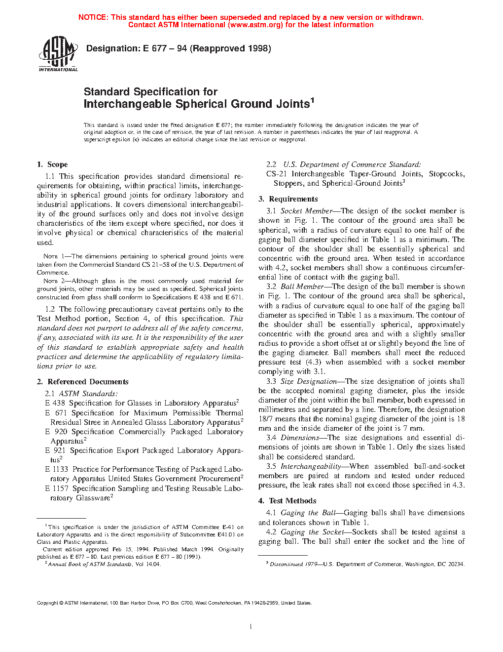 This specification covers standard dimensional requirements for obtaining interchangeable spherical ground joints. This specification does not include physical, chemical, and design characteristics of material used. Dimensional requirements include socket member design, ball member design, size designation, dimensions, and interchangeability. Ground joints shall be tested for ball and socket dimensions and leakage. Leak rate shall be calculated based on change in differential pressure, evacuated volume and time of test.