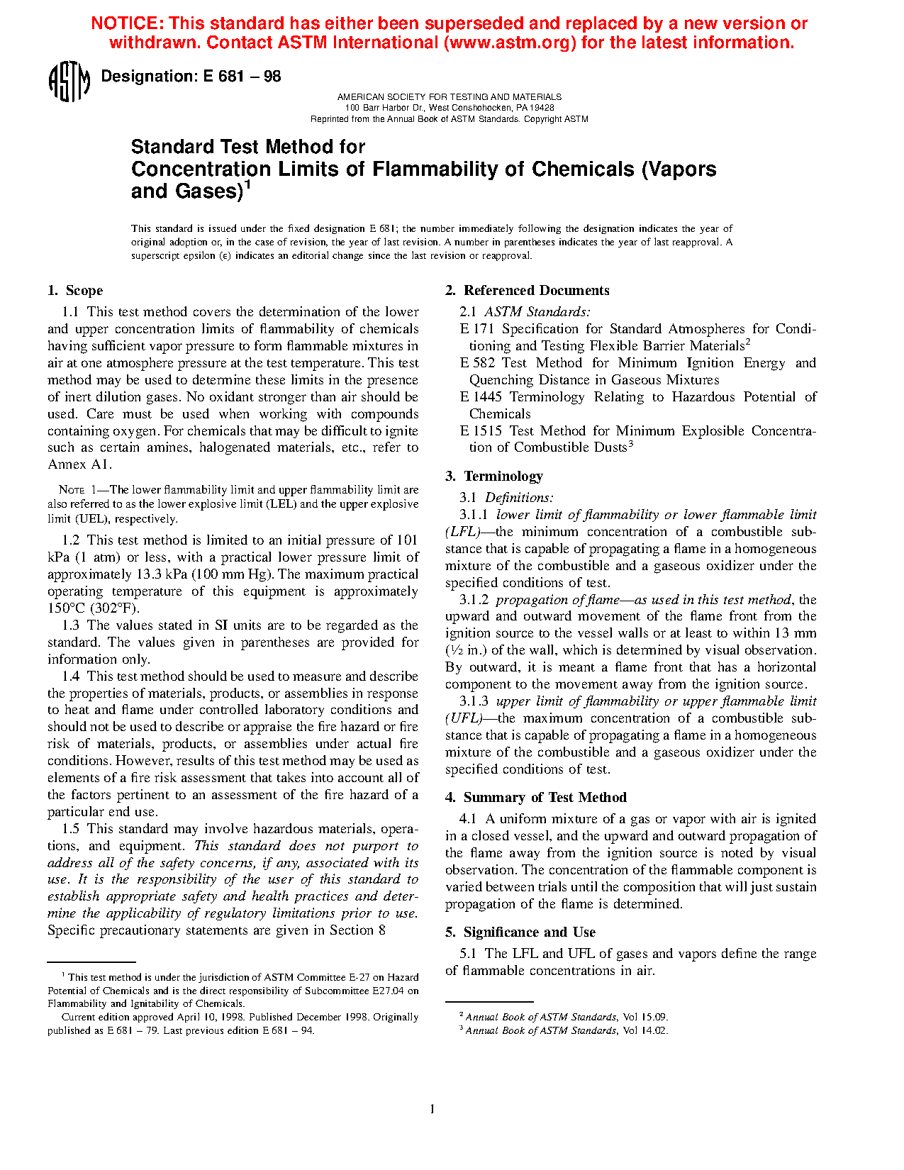 1.1 This test method covers the determination of the lower and upper concentration limits of flammability of chemicals having sufficient vapor pressure to form flammable mixtures in air at atmospheric pressure at the test temperature. This test method may be used to determine these limits in the presence of inert dilution gases. No oxidant stronger than air should be used.