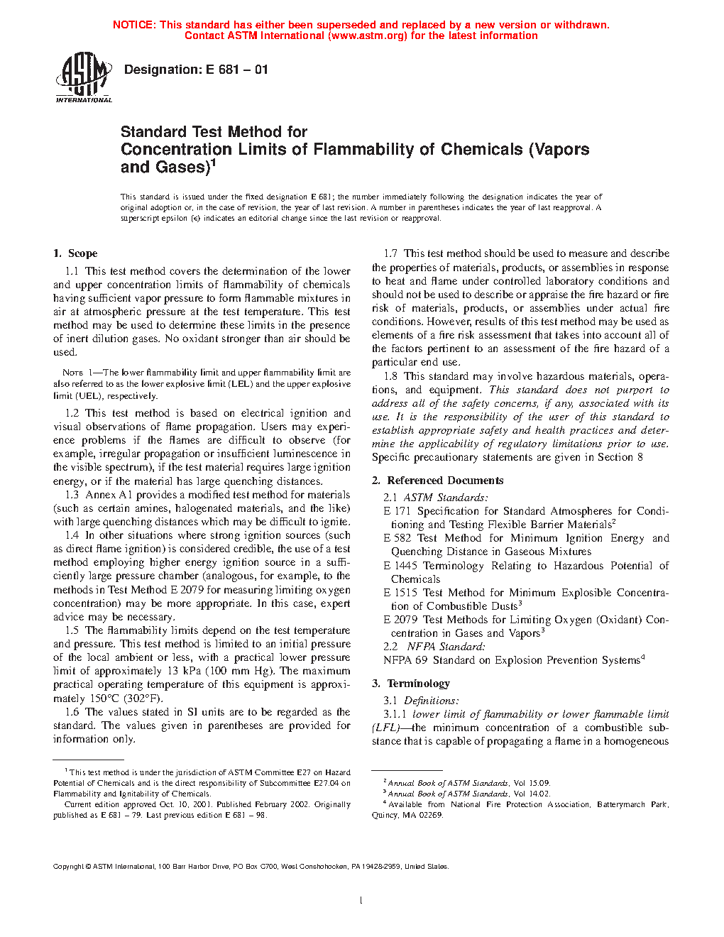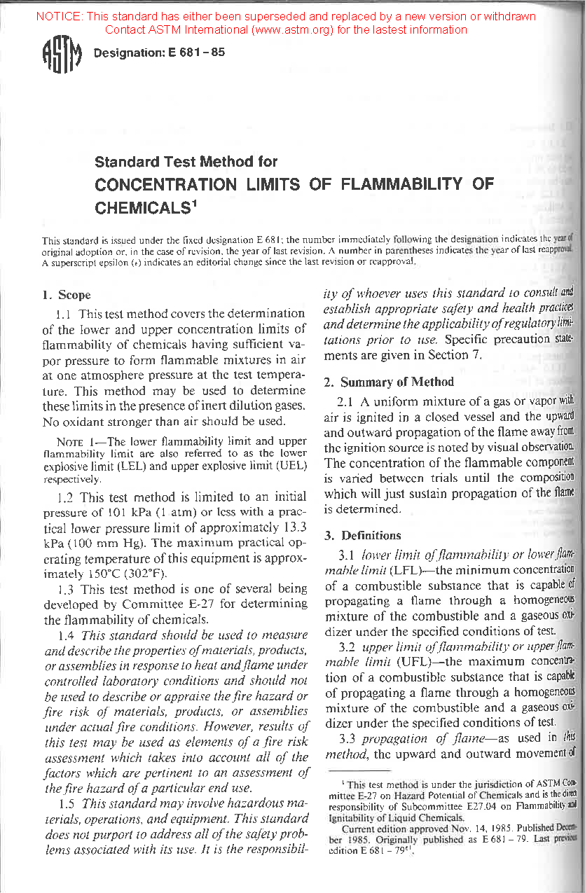 Note 1—The lower flammability limit and upper flammability limit are also referred to as the lower explosive limit (LEL) and the upper explosive limit (UEL), respectively.