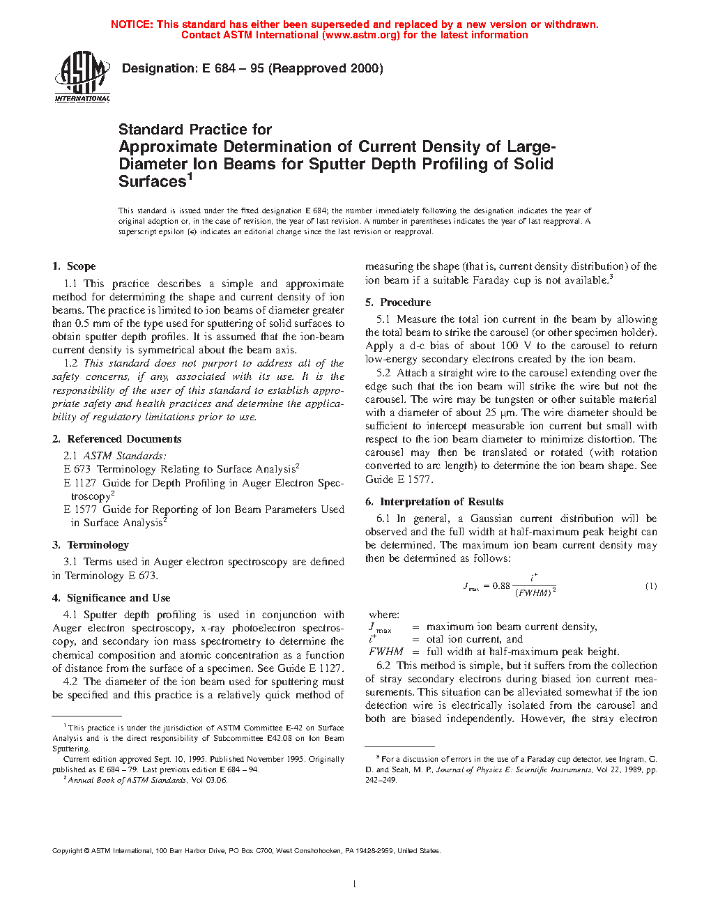 1.1 This practice describes a simple and approximate method for determining the shape and current density of ion beams. The practice is limited to ion beams of diameter greater than 0.5 mm of the type used for sputtering of solid surfaces to obtain sputter depth profiles. It is assumed that the ion-beam current density is symmetrical about the beam axis.