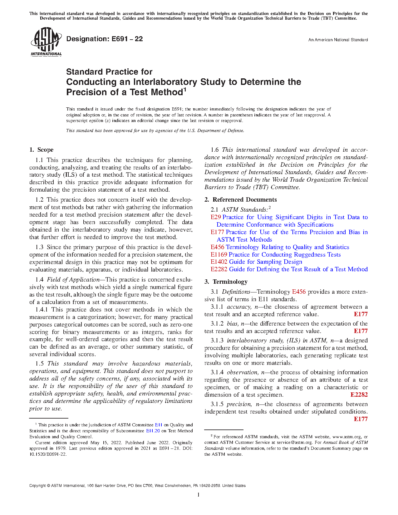 1.1 This practice describes the techniques for planning, conducting, analyzing, and treating the results of an interlaboratory study (ILS) of a test method. The statistical techniques described in this practice provide adequate information for formulating the precision statement of a test method.