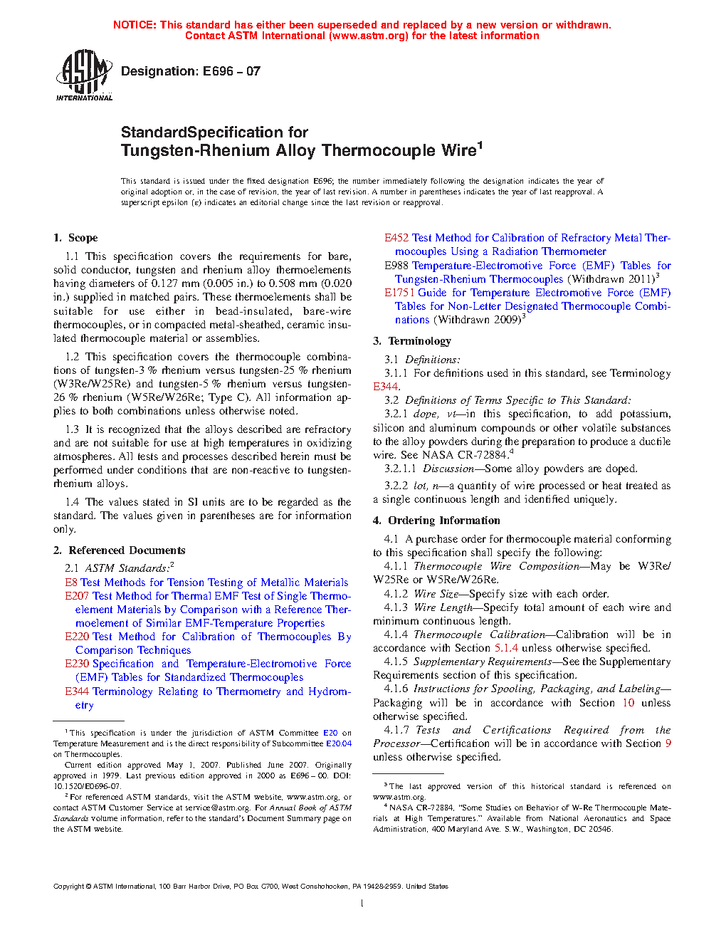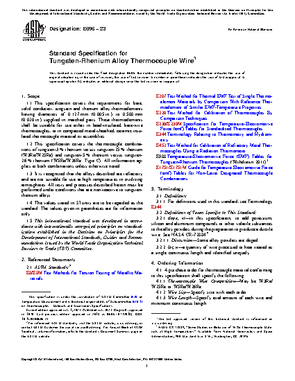 1.2 This specification covers the thermocouple combinations of tungsten-3% rhenium versus tungsten-25% rhenium (W3RE/W25RE) and tungsten-5% rhenium versus tungsten-26% rhenium (W5RE/W26RE). All information applies to both combinations unless otherwise noted.