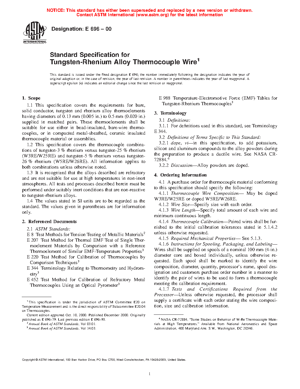1.3 It is recognized that the alloys described are refractory and are not suitable for use at high temperatures in non-inert atmospheres. All tests and processes described herein must be performed under suitably inert conditions that are nonreactive to tungsten-rhenium alloys.