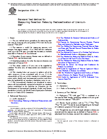 5.6 The 238U fission neutron spectrum-averaged cross section in several benchmark neutron fields is given in Table 3 of Practice E261. Sources for the latest recommended cross sections are given in Guide E1018. In the case of the 238U(n,f)F.P. reaction, the recommended cross section source is the ENDF/B-VI release 8 cross section (MAT = 9237) (8). Fig. 1 shows a plot of the recommended cross section versus neutron energy for the fast-neutron reaction 238U(n,f)F.P.