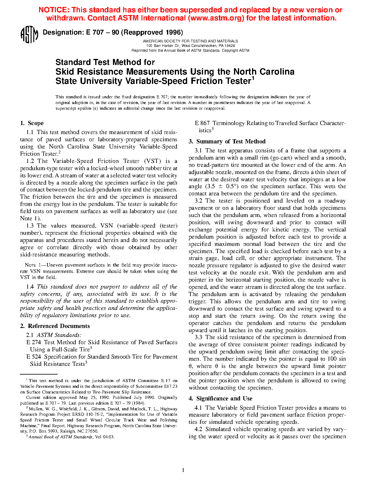 1.3 The values measured, VSN (variable-speed (tester) number), represent the frictional properties obtained with the apparatus and procedures stated herein and do not necessarily agree or correlate directly with those obtained by other skid-resistance measuring methods.