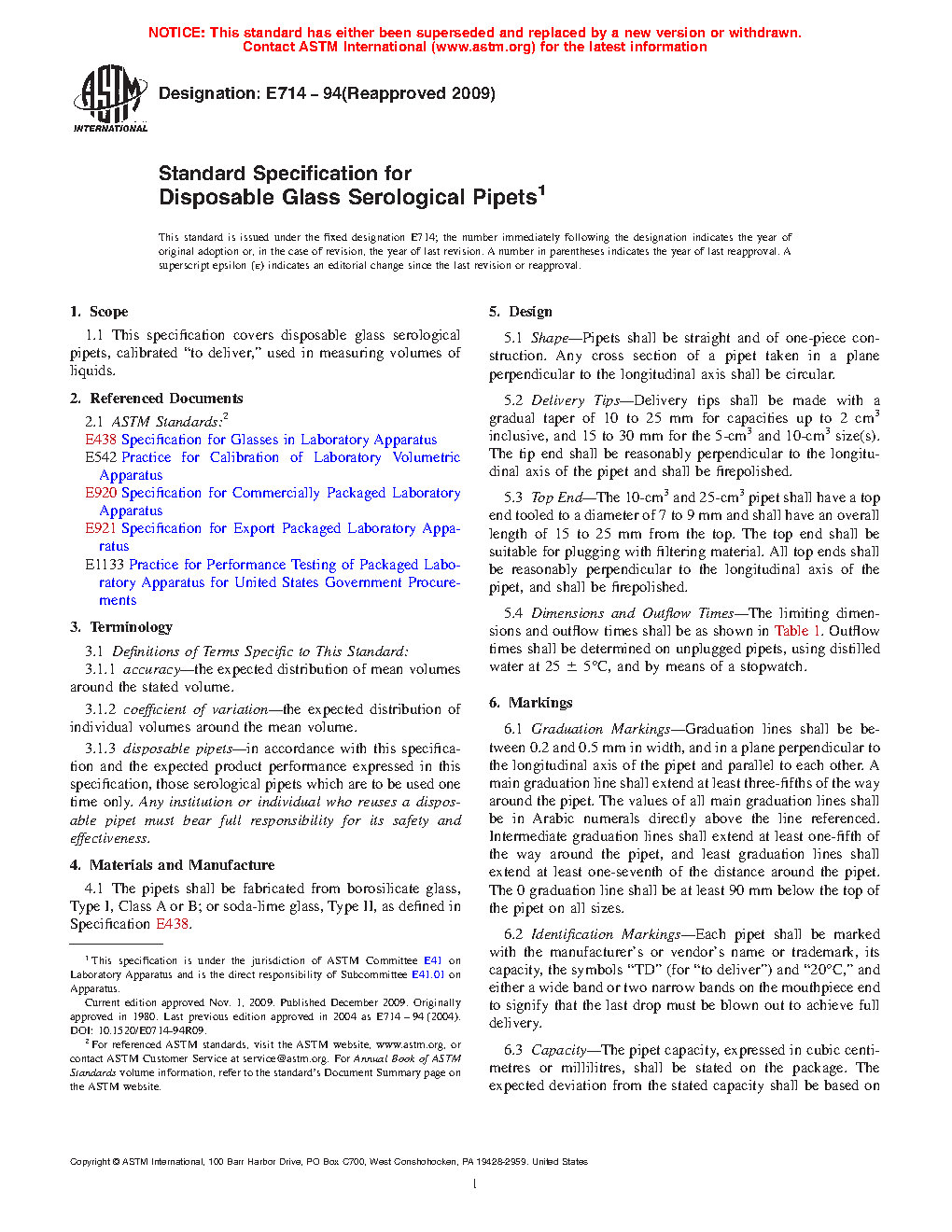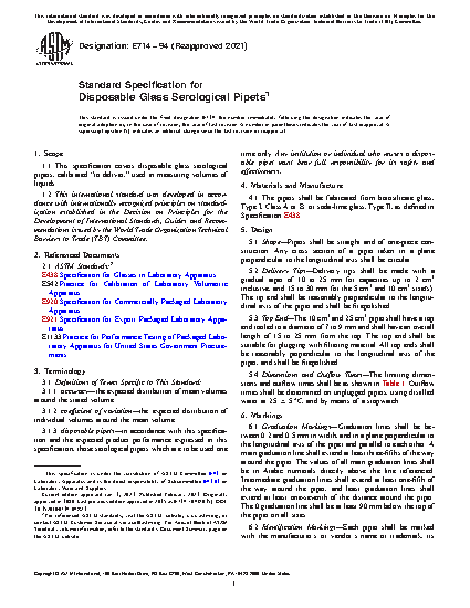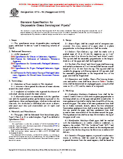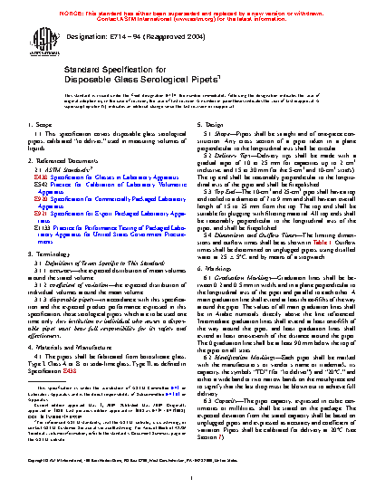 1.1 This specification covers disposable glass serological pipets, calibrated “to deliver,” used in measuring volumes of liquids.