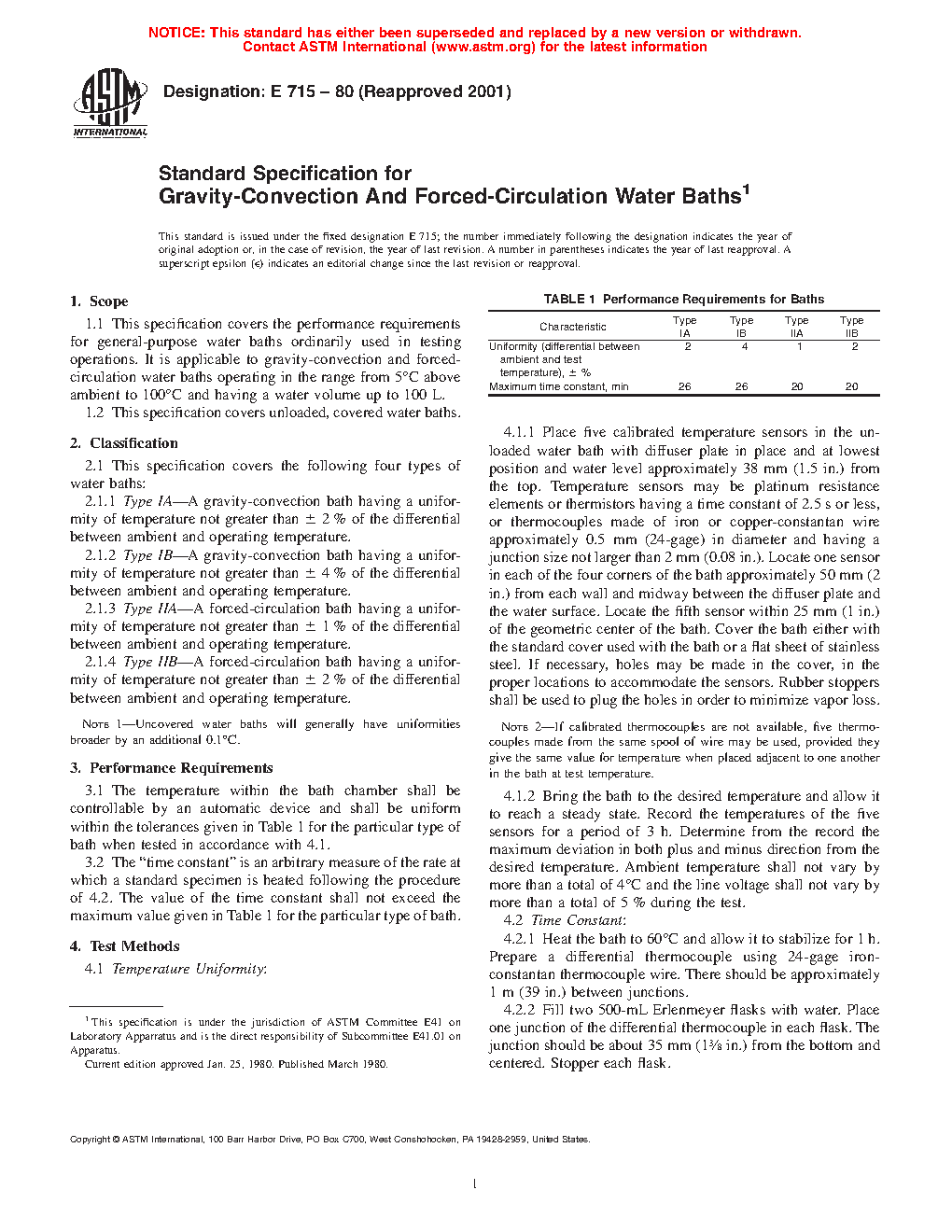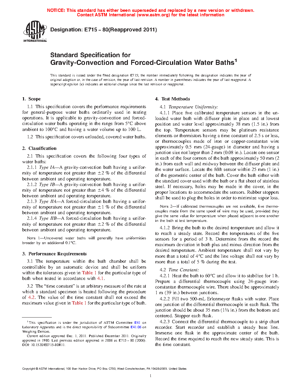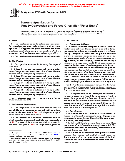 This specification covers the performance requirements for four types (Types IA, IB, IIA, and IIB) of unloaded and covered general-purpose gravity-convection and forced-circulation water baths ordinarily used in testing operations. The temperature within the bath chamber shall be controllable by an automatic device and, when examined by appropriate test methods, shall be uniform within the tolerances as to uniformity and time constant specified for the particular type of bath.