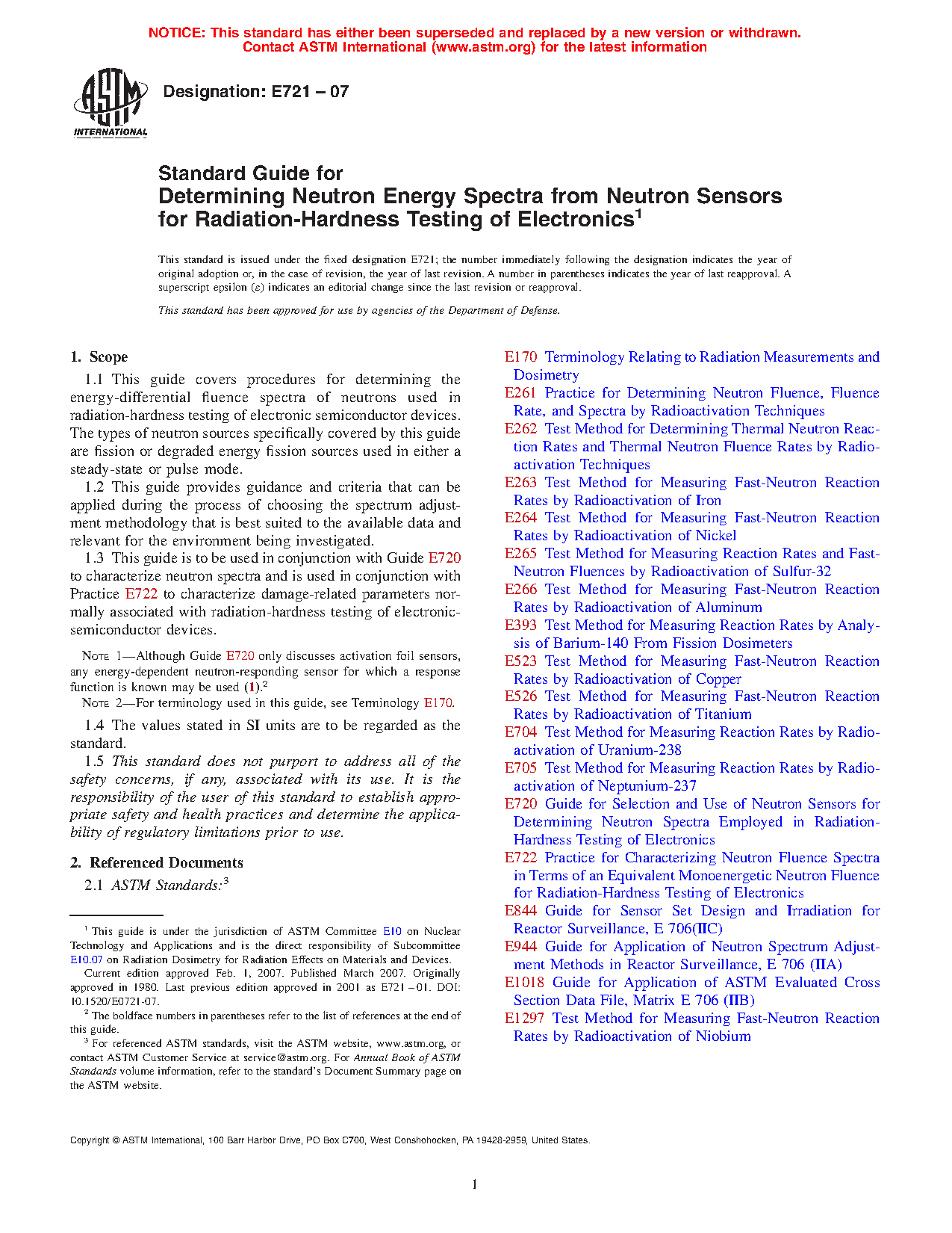 1.1 This guide covers procedures for determining the energy-differential fluence spectra of neutrons used in radiation-hardness testing of electronic semiconductor devices. The types of neutron sources specifically covered by this guide are fission or degraded energy fission sources used in either a steady-state or pulse mode.