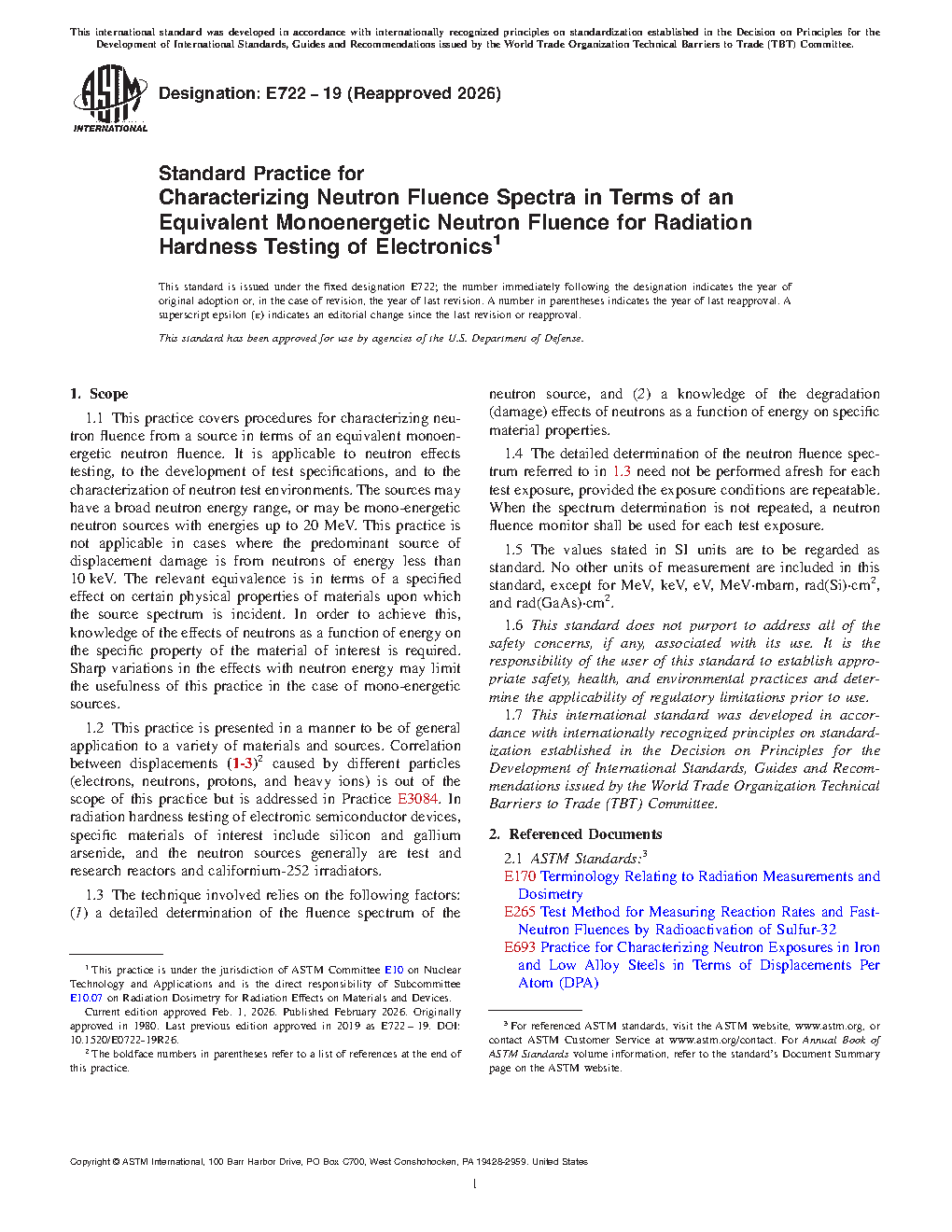 1.1 This practice covers procedures for characterizing a neutron fluence from a source in terms of an equivalent monoenergetic neutron fluence. It is applicable to neutron effects testing, to the development of test specifications, and to the characterization of neutron test environments. The sources may have a broad neutron-energy spectrum, or may be mono-energetic neutron sources with energies up to 20 MeV. The relevant equivalence is in terms of a specified effect on certain physical properties of materials upon which the source spectrum is incident. In order to achieve this, knowledge of the effects of neutrons as a function of energy on the specific property of the material of interest is required. Sharp variations in the effects with neutron energy may limit the usefulness of this practice in the case of mono-energetic sources.