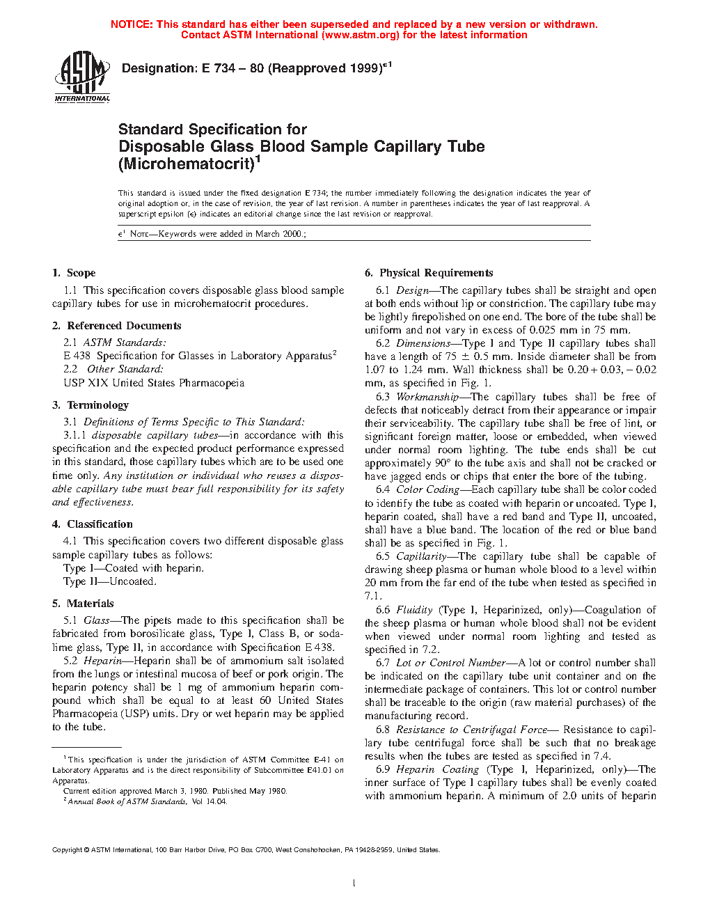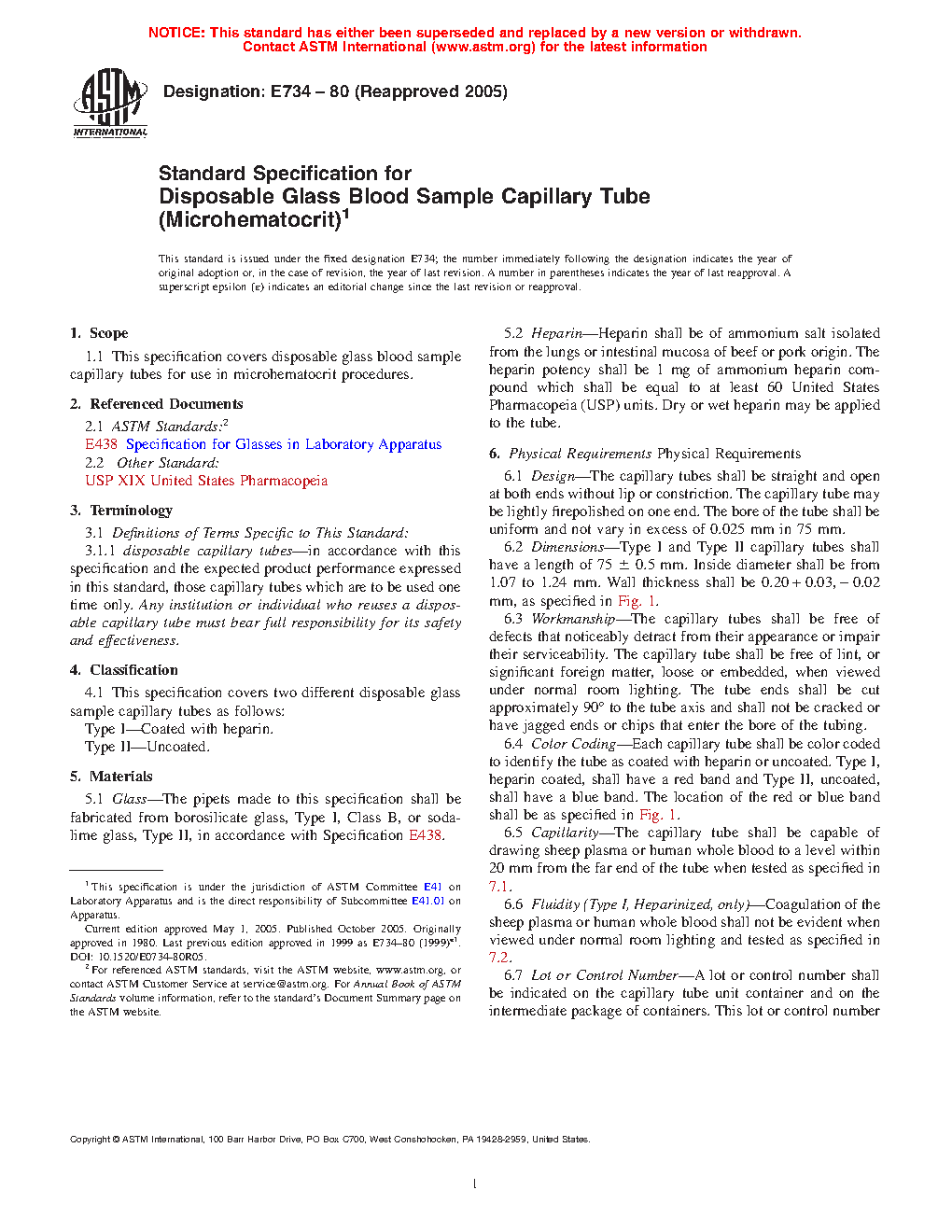 Standard Specification for Disposable Glass Blood Sample Capillary Tube (Microhematocrit)