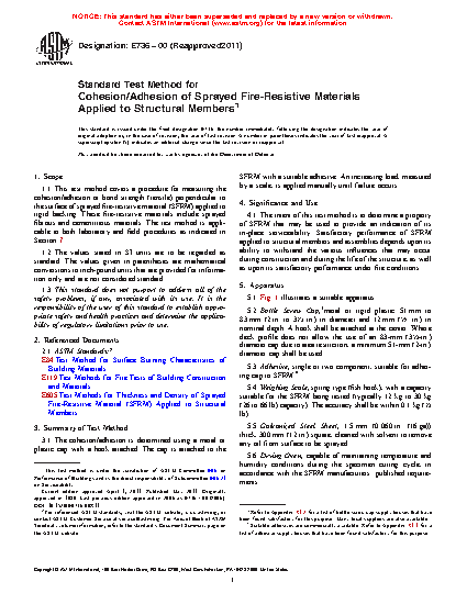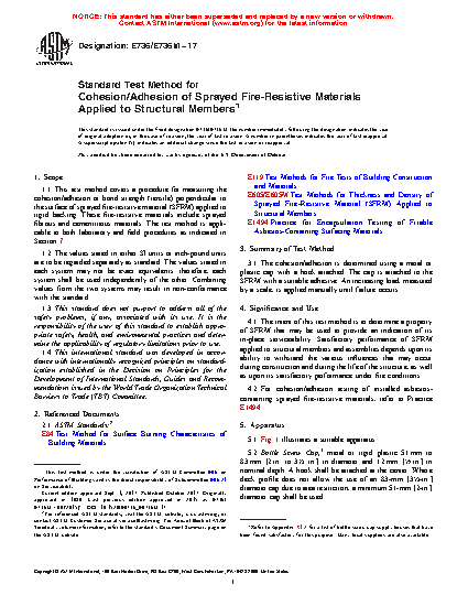 1.1 This test method covers a procedure for measuring the cohesion/adhesion or bond strength (tensile) perpendicular to the surface of sprayed fire-resistive material (SFRM) applied to rigid backing. These fire-resistive materials include sprayed fibrous and cementitious materials. The test method is applicable to both laboratory and field procedures as indicated in Section 7.