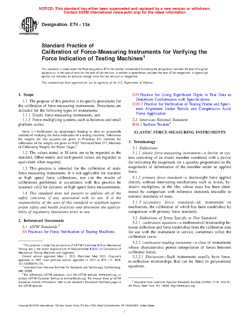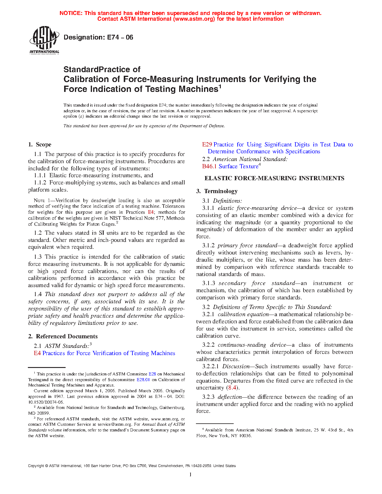 4.1 Testing machines that apply and indicate force are in general use in many industries. Practices E4 has been written to provide a practice for the force verification of these machines. A necessary element in Practices E4 is the use of force-measuring instruments whose force characteristics are known to be traceable to the SI. Practices E74 describes how these force-measuring instruments are to be calibrated. The procedures are useful to users of testing machines, manufacturers and providers of force-measuring instruments, calibration laboratories that provide the calibration of the instruments and the documents of traceability, service organizations that use the force-measuring instruments to verify testing machines, and testing laboratories performing general structural test measurements.