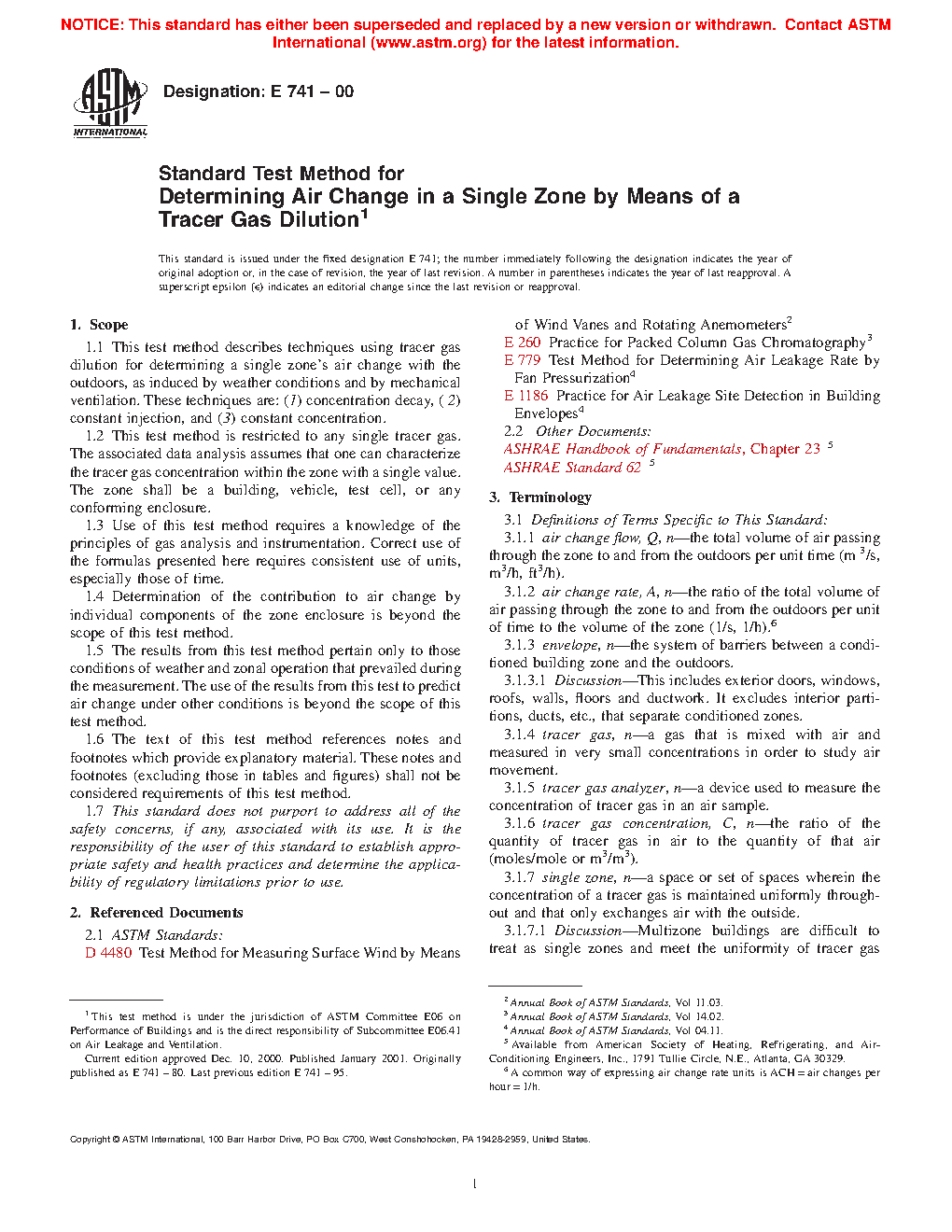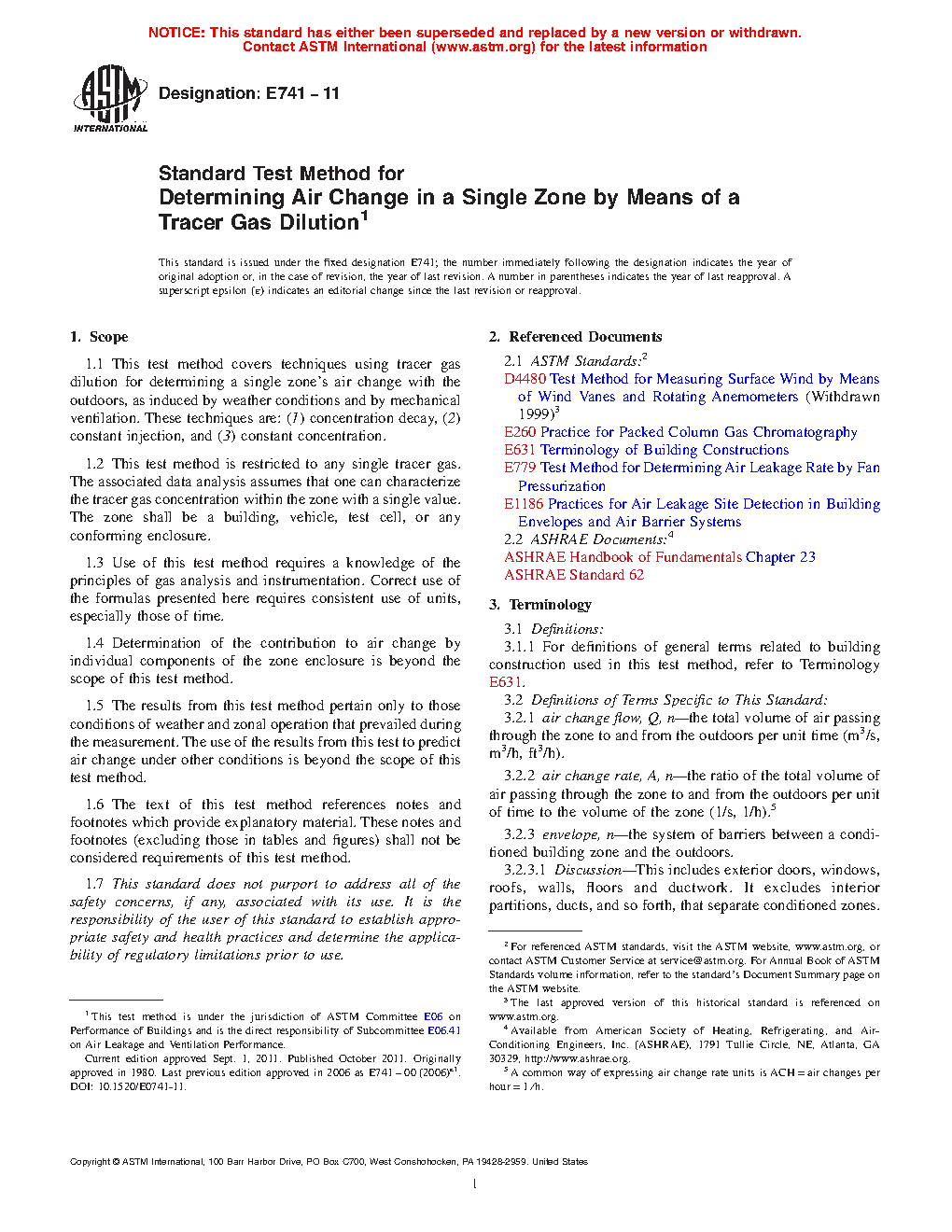 1.1 This test method covers techniques using tracer gas dilution for determining a single zone's air change with the outdoors, as induced by weather conditions and by mechanical ventilation. These techniques are: (1) concentration decay, (2) constant injection, and (3) constant concentration.
