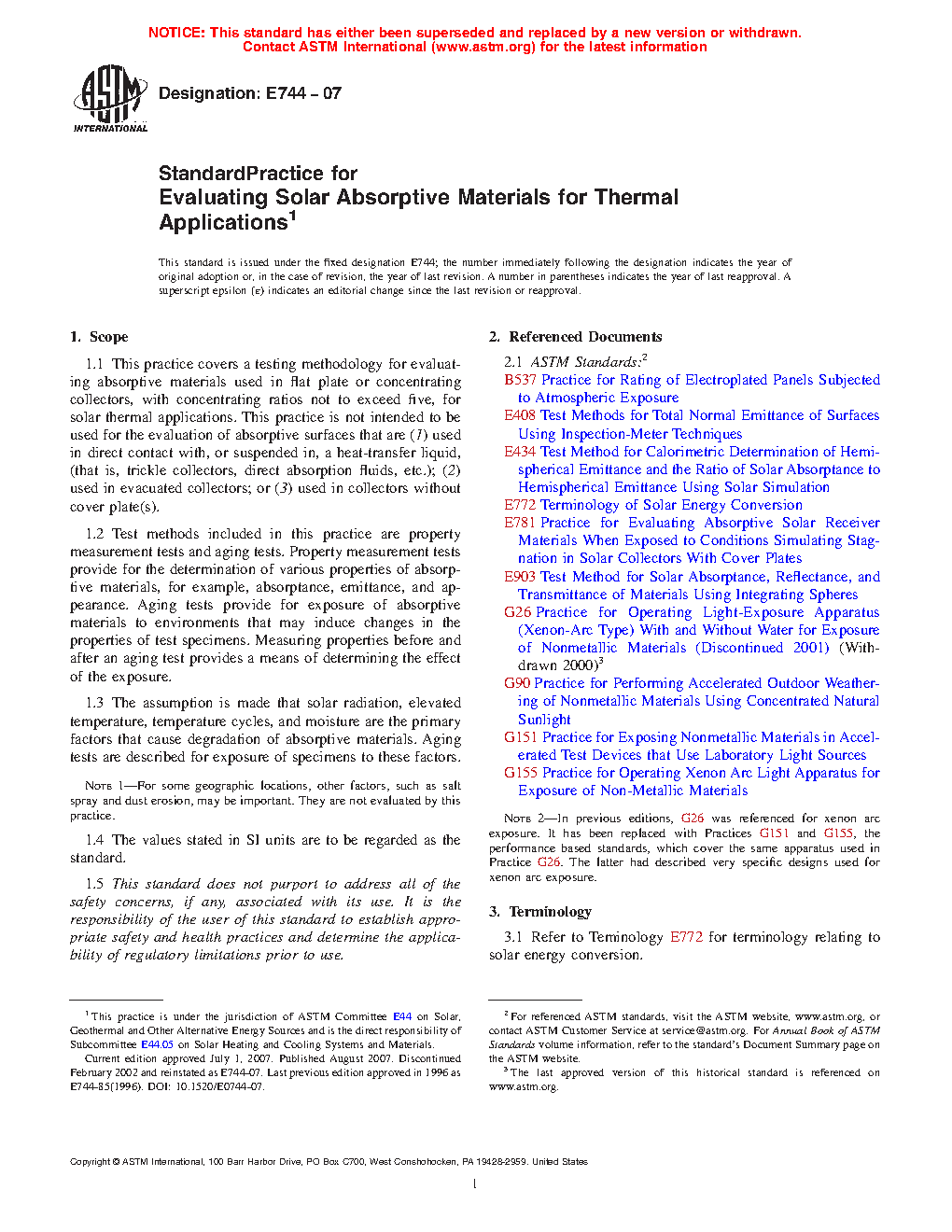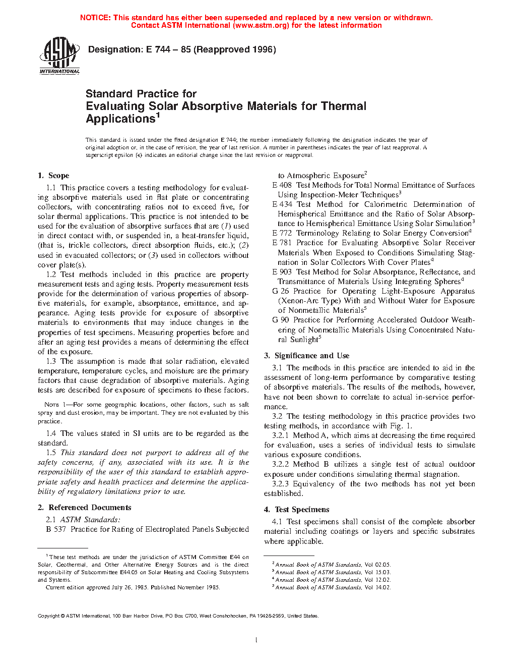 1.1 This practice covers a testing methodology for evaluating absorptive materials used in flat plate or concentrating collectors, with concentrating ratios not to exceed five, for solar thermal applications. This practice is not intended to be used for the evaluation of absorptive surfaces that are (1) used in direct contact with, or suspended in, a heat-transfer liquid, (that is, trickle collectors, direct absorption fluids, etc.); (2) used in evacuated collectors; or (3) used in collectors without cover plate(s).