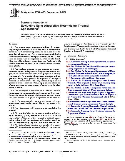 1.1 This practice covers a testing methodology for evaluating absorptive materials used in flat plate or concentrating collectors, with concentrating ratios not to exceed five, for solar thermal applications. This practice is not intended to be used for the evaluation of absorptive surfaces that are (1) used in direct contact with, or suspended in, a heat-transfer liquid, (that is, trickle collectors, direct absorption fluids, etc.); (2) used in evacuated collectors; or (3) used in collectors without cover plate(s).