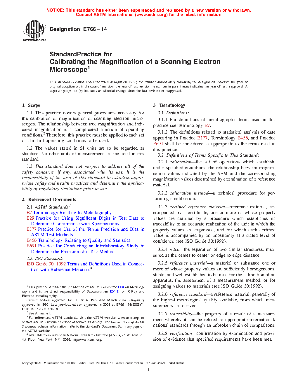4.2 The use of calibration specimens traceable to international/national standards, such as NIST-SRM 484, with this practice will yield magnifications accurate to better than 5 % over the calibrated range of operating conditions.