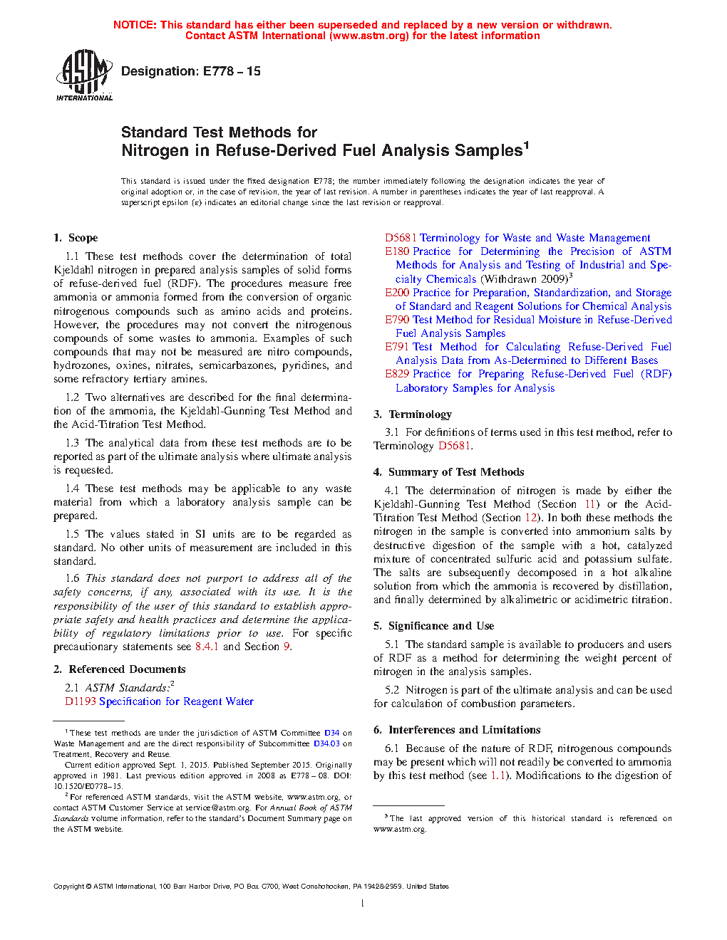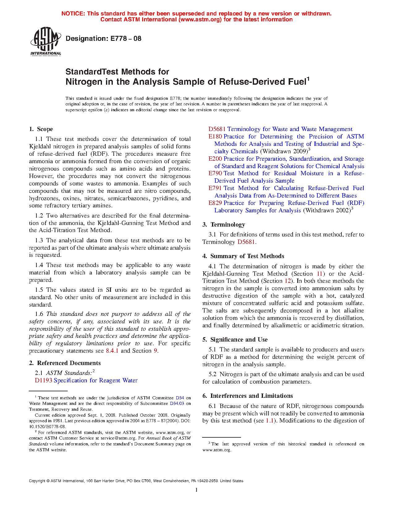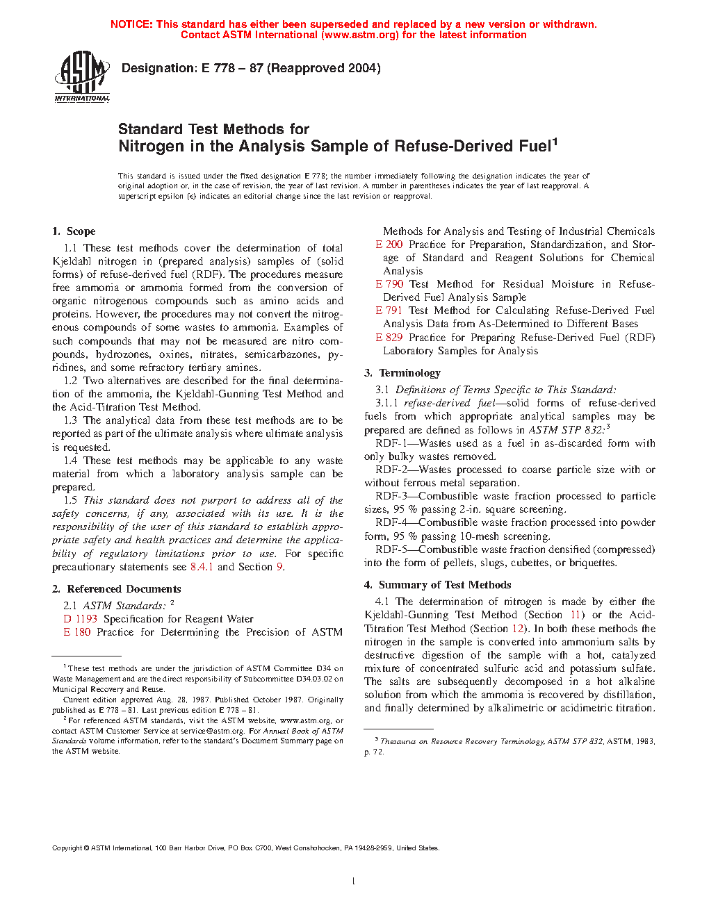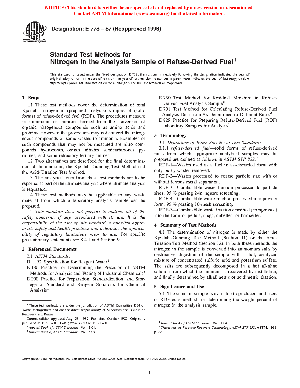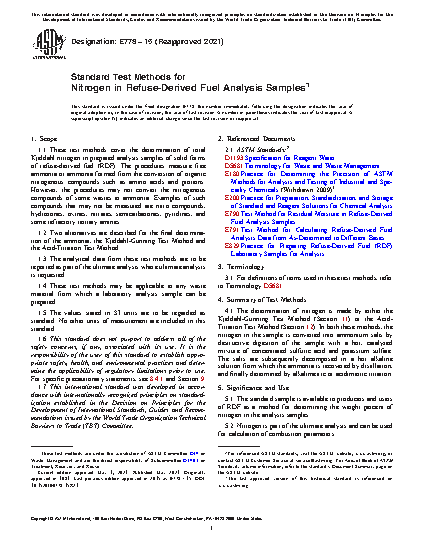 1.1 These test methods cover the determination of total Kjeldahl nitrogen in prepared analysis samples of solid forms of refuse-derived fuel (RDF). The procedures measure free ammonia or ammonia formed from the conversion of organic nitrogenous compounds such as amino acids and proteins. However, the procedures may not convert the nitrogenous compounds of some wastes to ammonia. Examples of such compounds that may not be measured are nitro compounds, hydrozones, oxines, nitrates, semicarbazones, pyridines, and some refractory tertiary amines.