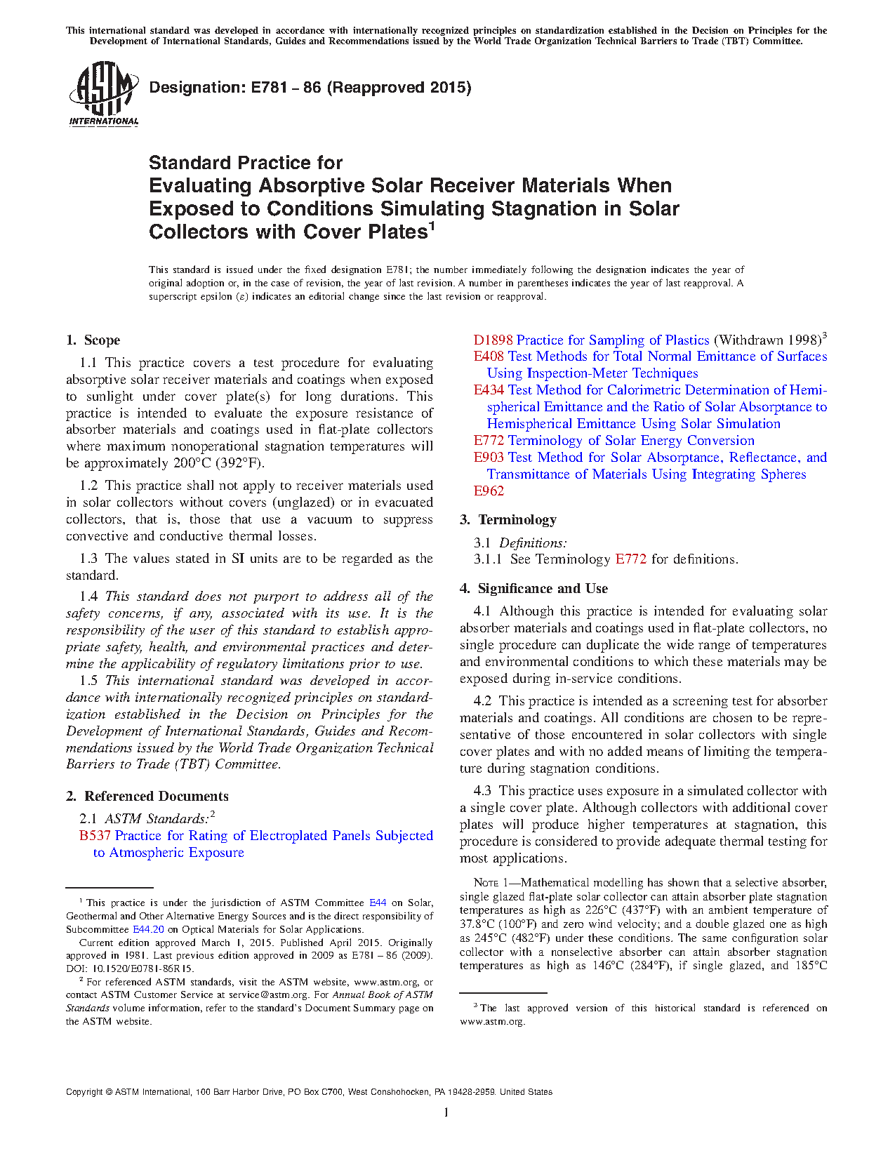 1.1 This practice covers a test procedure for evaluating absorptive solar receiver materials and coatings when exposed to sunlight under cover plate(s) for long durations. This practice is intended to evaluate the exposure resistance of absorber materials and coatings used in flat-plate collectors where maximum nonoperational stagnation temperatures will be approximately 200°C (392°F).