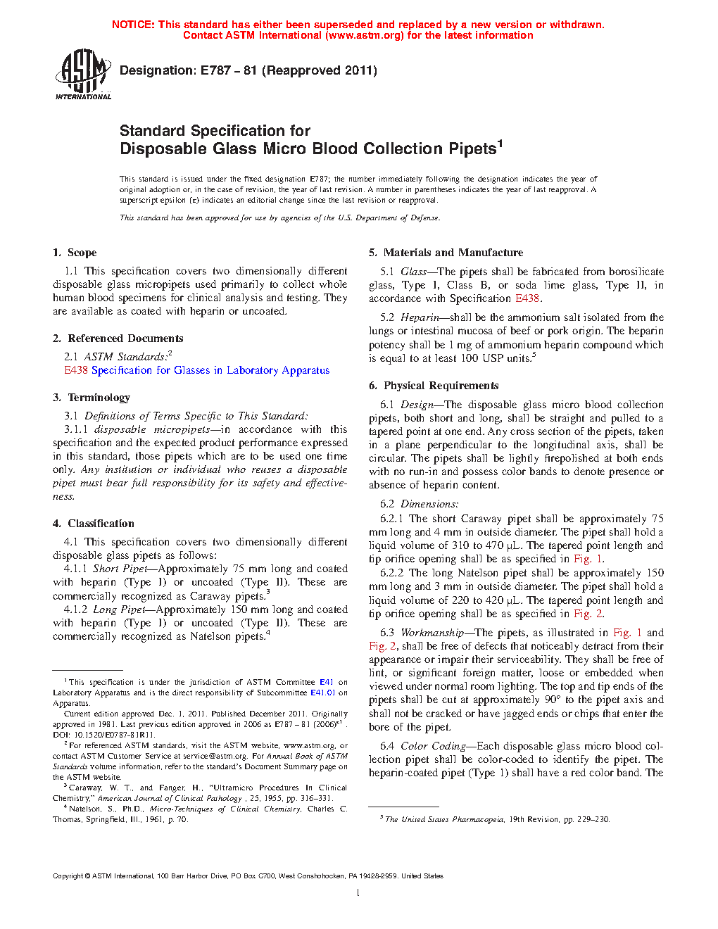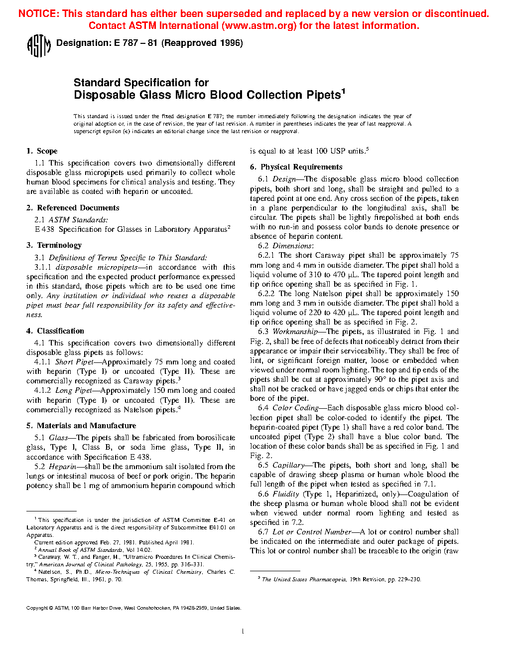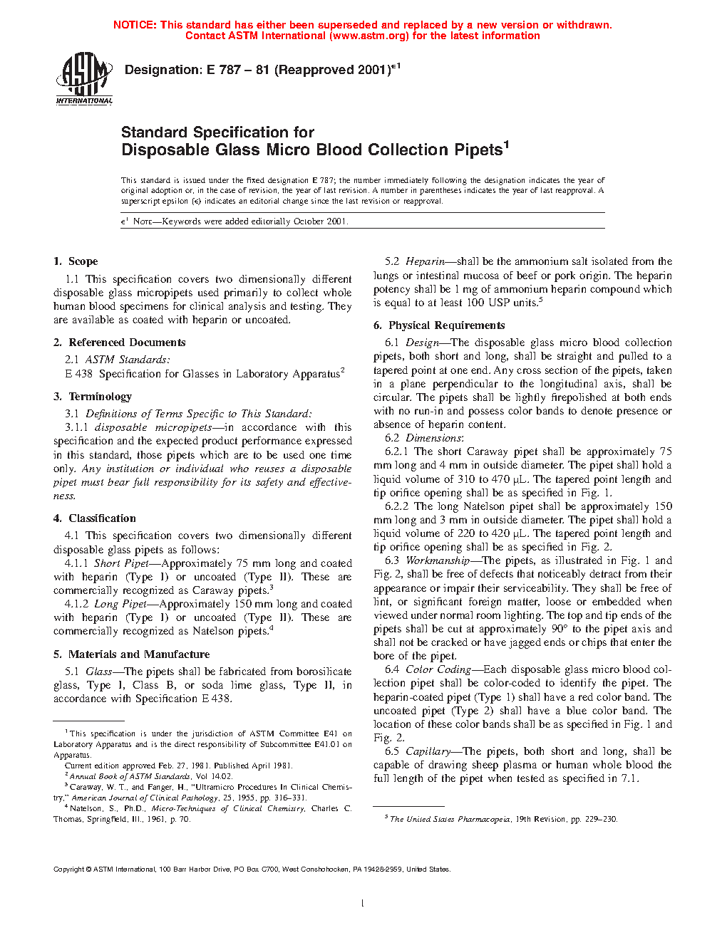 This specification covers two dimensionally different (short and long) disposable glass micropipets used primarily to collect whole human blood specimens for clinical analysis and testing. Short and long pipets are available as coated with heparin (Type I) or uncoated (Type II).The pipets shall be fabricated from borosilicate glass, Type I, Class B, or soda lime glass, Type II. Heparin shall be the ammonium salt isolated from the lungs or intestinal mucosa of beef or pork origin and shall meet the specified heparin potency. The physical requirements including design, dimensions, workmanship, color coding, capillarity, fluidity, lot or control number, resistance to centrifugal force, and heparin coating are specified. The following tests shall be performed: capillarity test, fluidity test, sheep plasma test, human whole blood test, resistance to centrifugal force test, and heparin content test. The physical requirements for short Caraway pipet and long Natelson pipet are illustrated as well.