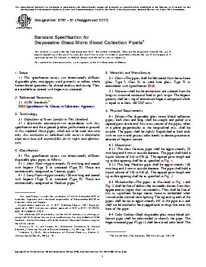 1.1 This specification covers two dimensionally different disposable glass micropipets used primarily to collect whole human blood specimens for clinical analysis and testing. They are available as coated with heparin or uncoated.