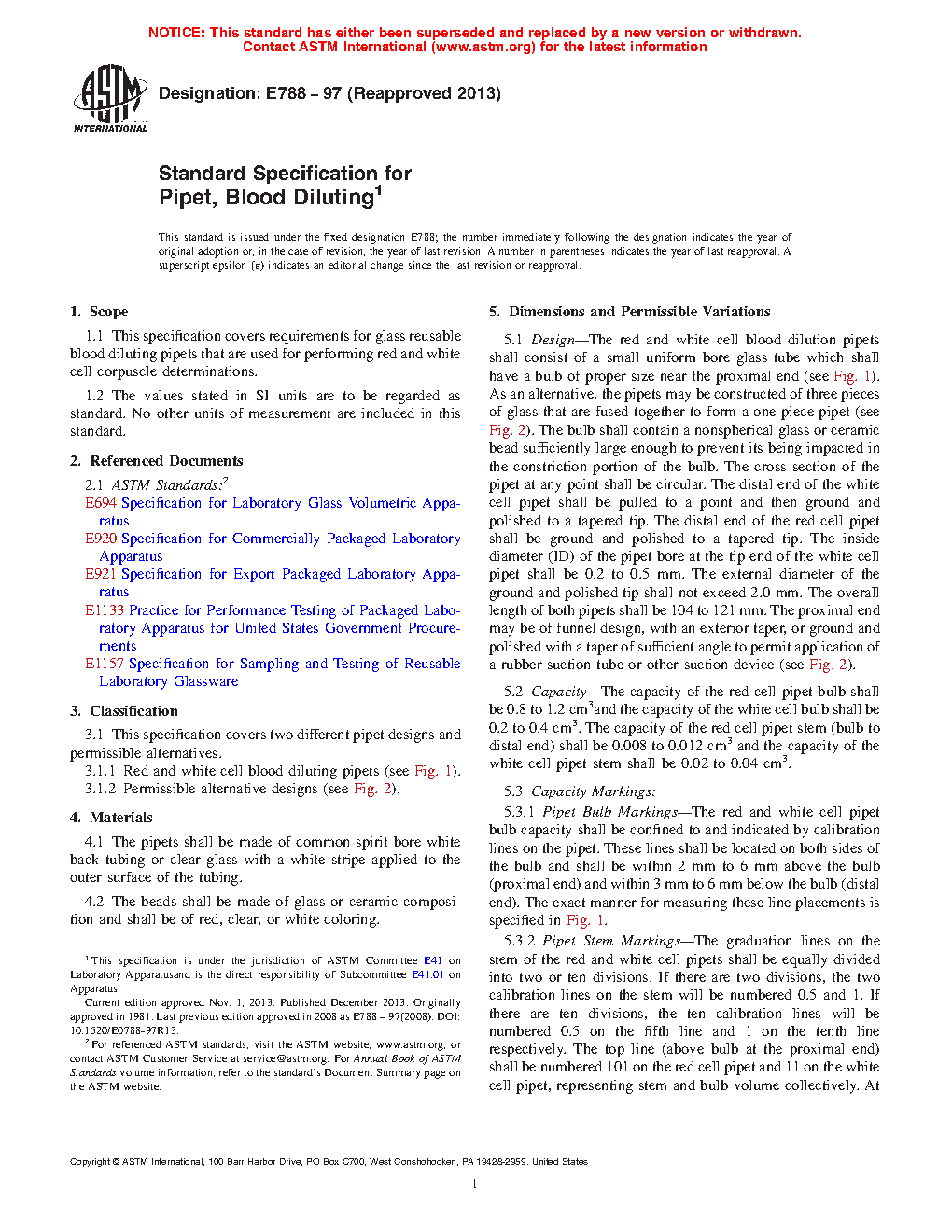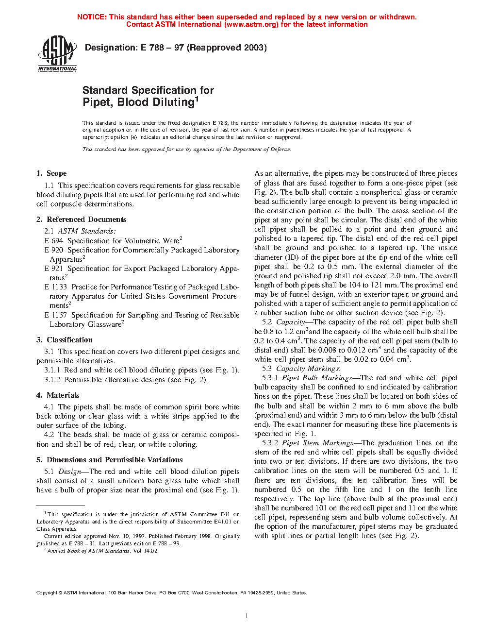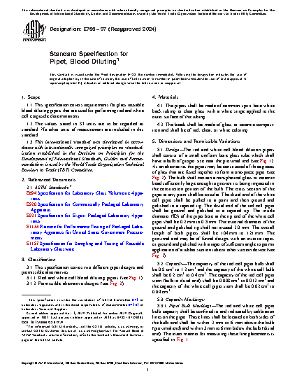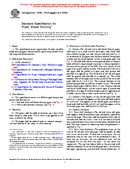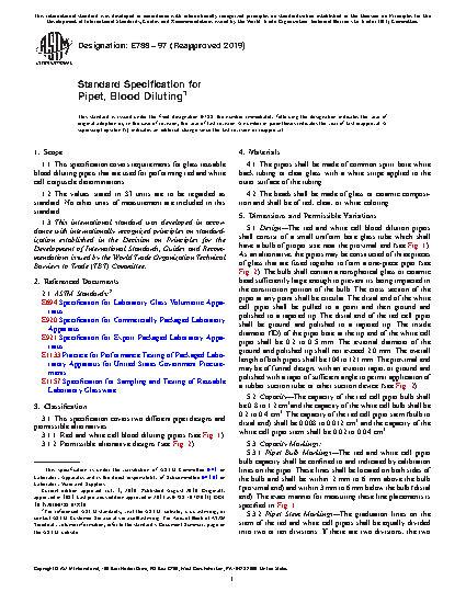 This specification covers the requirements for glass reusable blood diluting pipets that are used for performing red and white cell corpuscle determinations. The pipets shall be made of common spirit bore white back tubing or clear glass with a white stripe applied to the outer surface of the tubing. The beads shall be made of glass or ceramic composition and shall be of red, clear, or white coloring. Materials shall be tested and the individual types shall conform to specified values of design, capacity, capacity markings, graduation lines, accuracy, workmanship, identification, and pigmentation.