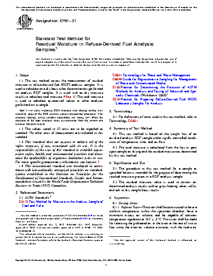 1.1 This test method covers the measurement of residual moisture in refuse-derived fuel (RDF) analysis samples. It is used to calculate on a dry basis other determinations performed on analysis RDF samples. It is used with air-dry moisture results to calculate total moisture (Note 1). The total moisture is used to calculate as-received values or other analyses performed on a sample.