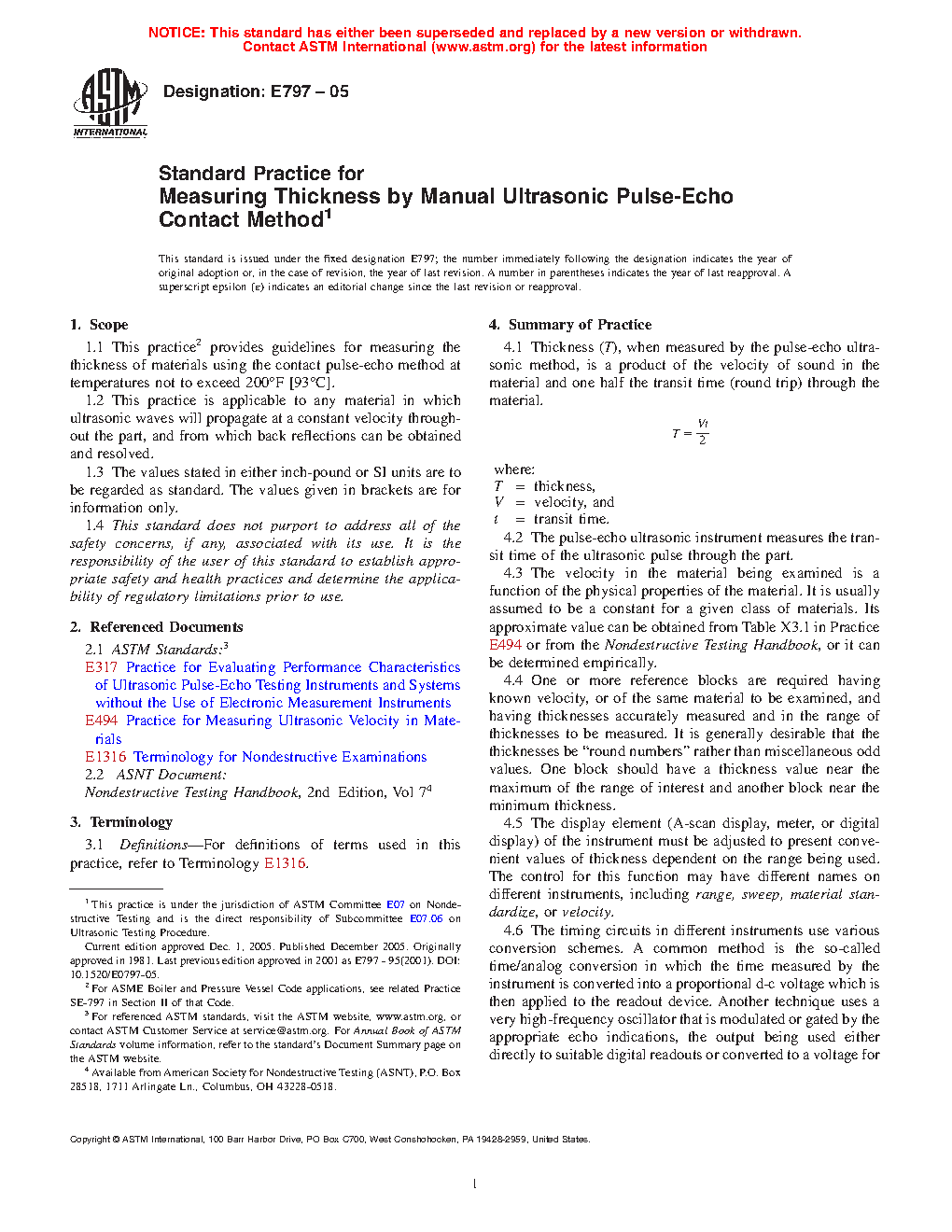 1.1 This practice provides guidelines for measuring the thickness of materials using the contact pulse-echo method at temperatures not to exceed 93°C (200°F).
