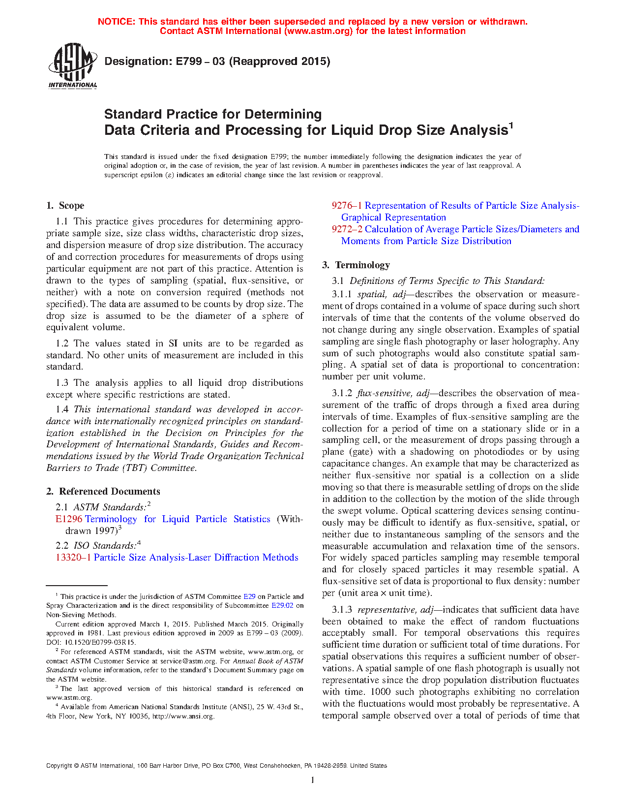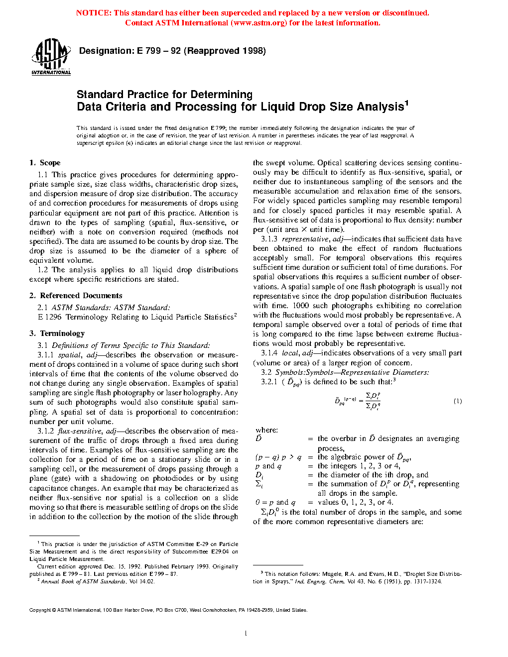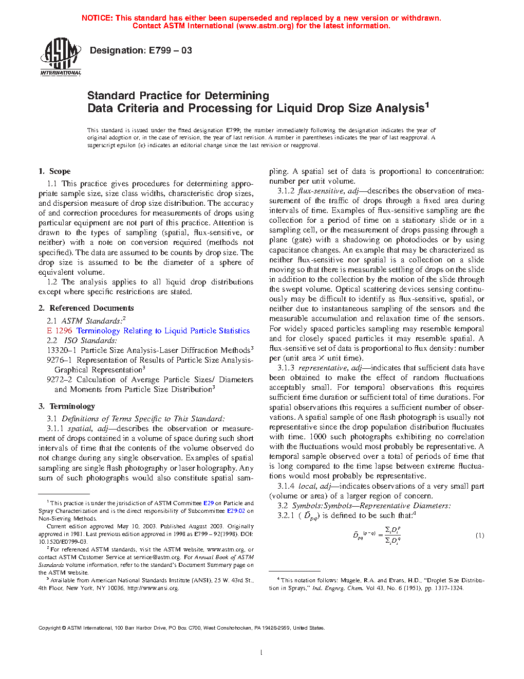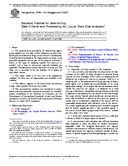 1.1 This practice gives procedures for determining appropriate sample size, size class widths, characteristic drop sizes, and dispersion measure of drop size distribution. The accuracy of and correction procedures for measurements of drops using particular equipment are not part of this practice. Attention is drawn to the types of sampling (spatial, flux-sensitive, or neither) with a note on conversion required (methods not specified). The data are assumed to be counts by drop size. The drop size is assumed to be the diameter of a sphere of equivalent volume.