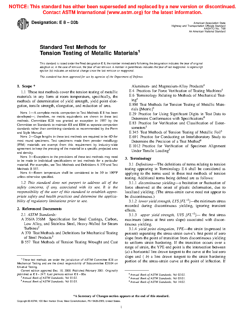 1.1 These test methods cover the tension testing of metallic materials in any form at room temperature, specifically, the methods of determination of yield strength, yield point elongation, tensile strength, elongation, and reduction of area.