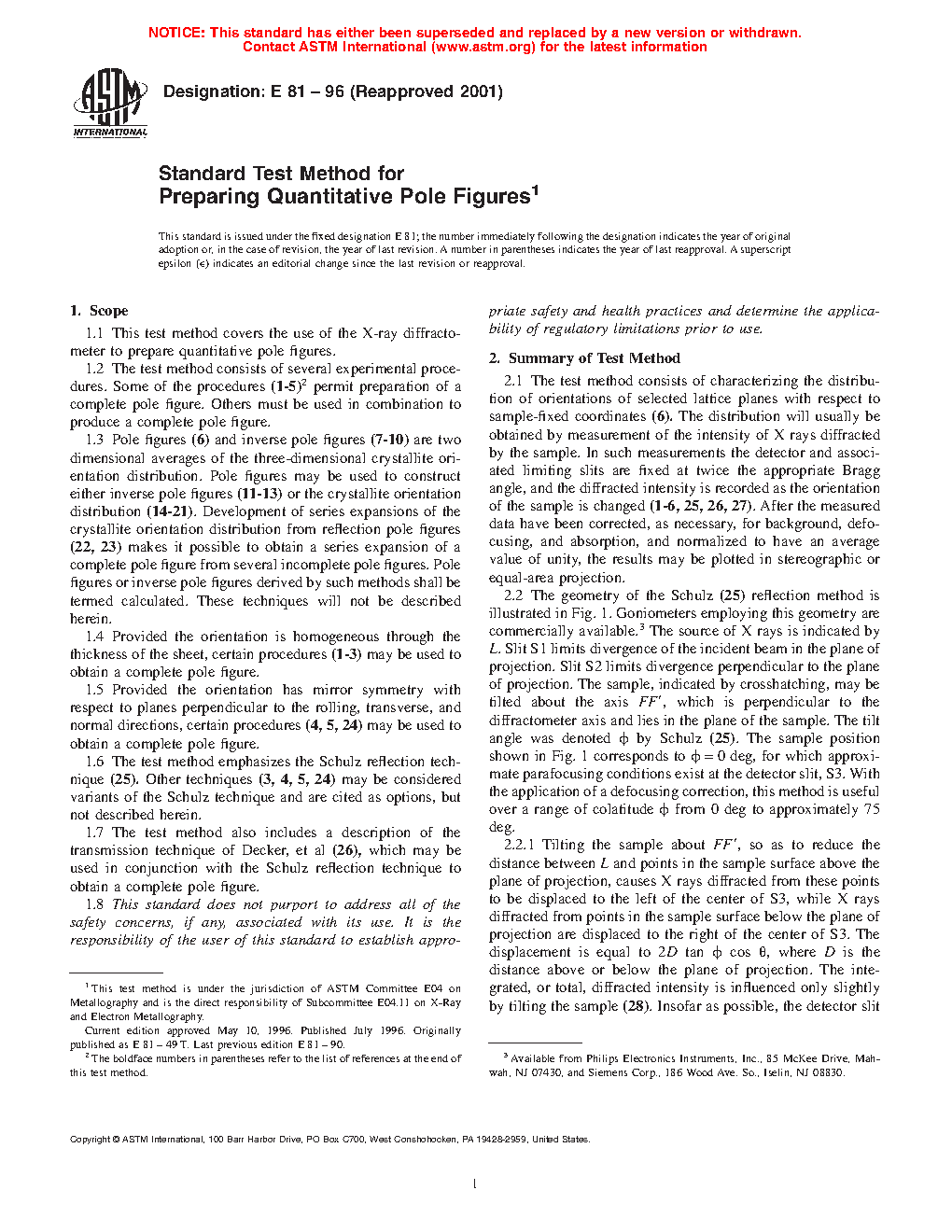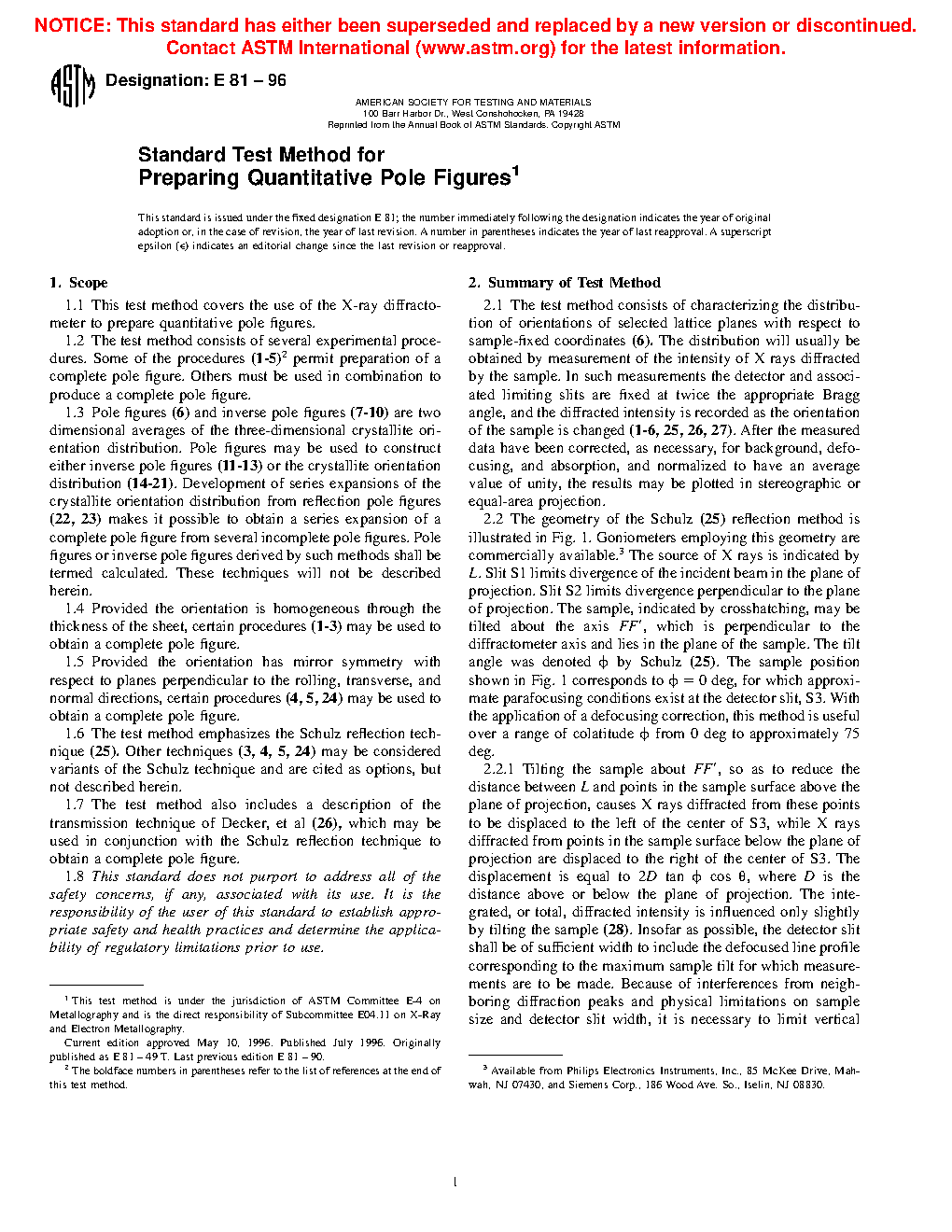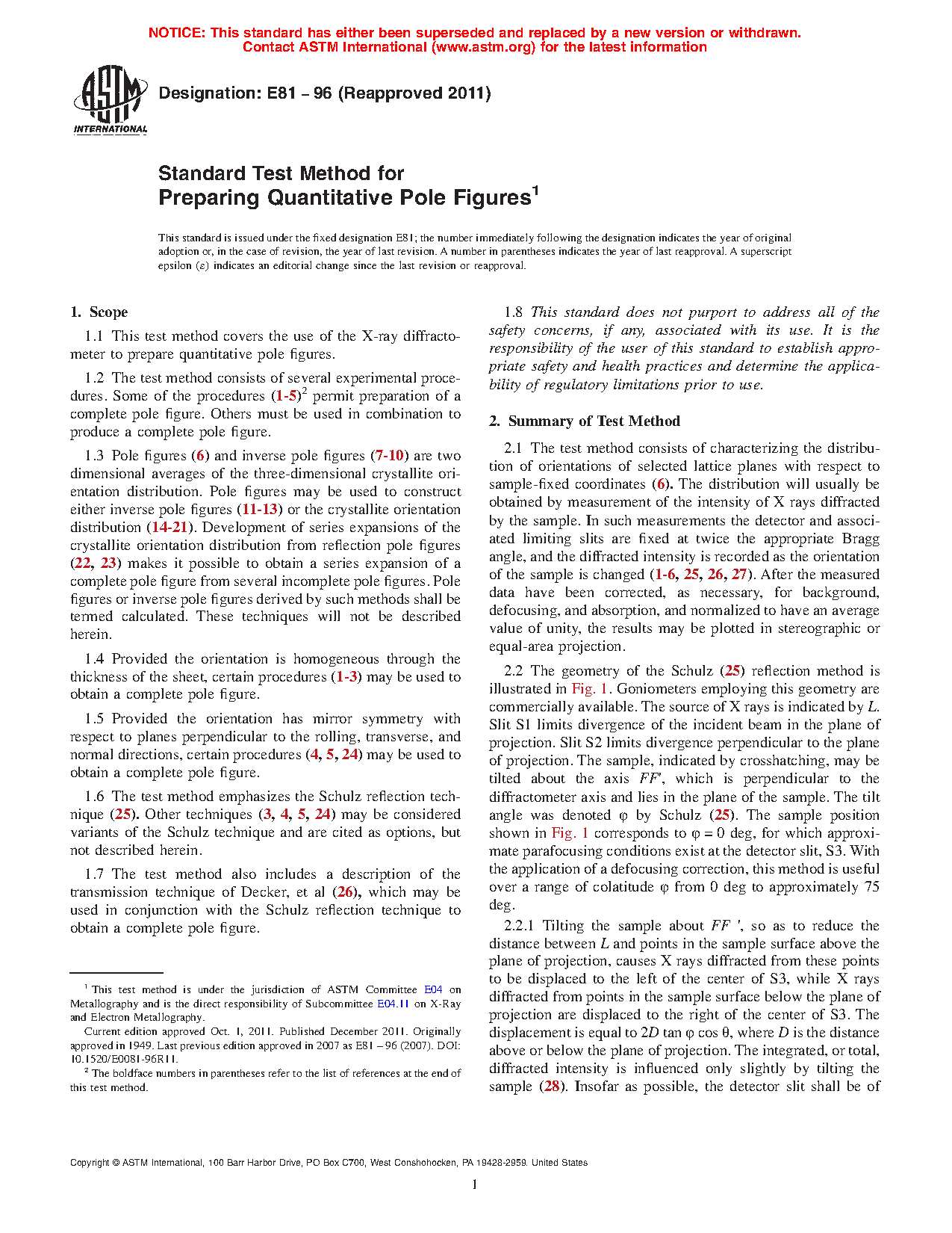 1.7 The test method also includes a description of the transmission technique of Decker, et al (26), which may be used in conjunction with the Schulz reflection technique to obtain a complete pole figure.