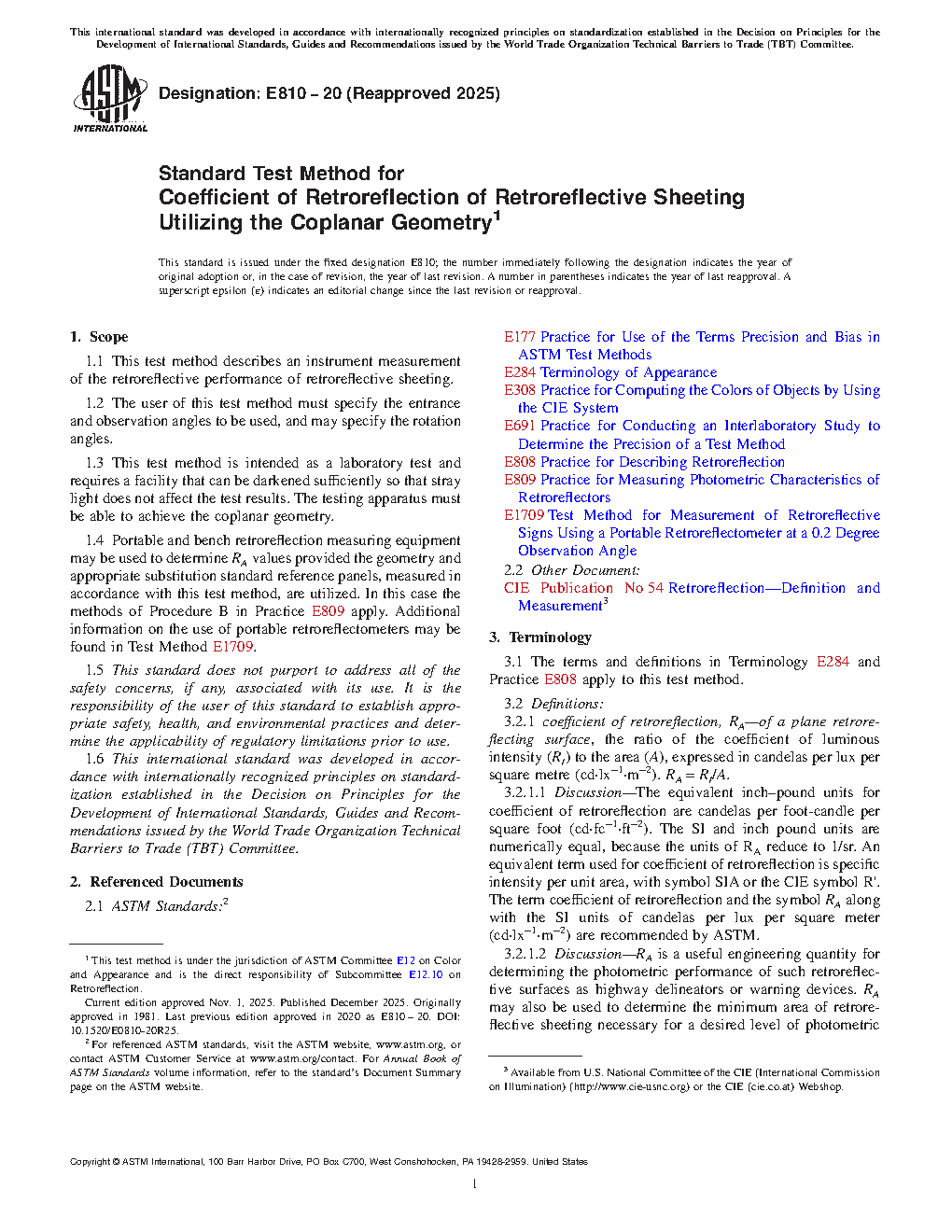 1.4 Portable and bench retroreflection measuring equipment may be used to determine RA values provided the geometry and appropriate substitutional standard reference panels, measured in accordance with this test method, are utilized. In this case the methods of Procedure B in Practice E809 apply. Additional information on the use of portable retroreflectometers may be found in Test Method E 1709.